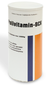 Kullanma Tarifnamesi ( amacı,hayvan türü,tavsiye edilen miktar ): Kanatlı hayvanların vitamin ihtiyacını karşılamak üzere 1 ton içme suyuna 0,1 kg POLİVİTAMİN BCK homojen bir karışım sağlamak üzere 0,5 kg’a tamamlayarak kullanılır. |