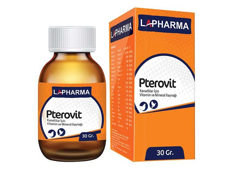 Pterovit Kanatlılar İçin Vitamin ve Mineral Kaynağı KULLANIM AMACI Kanatlı hayvanlarda vitamin, mineral ve aminoasit ihtiyacını karşılamak amacıyla kullanılır. Ayrıca yumurta kalitesinin arttırılması ve yumurta verim artışında kullanılır. Civcivlerde ise kısa sürede gelişimi hızlandırarak daha sağlıklı hale getirir. Pterovit KULLANIM ŞEKLİTavsiye edilen kullanım şekli; 5 gr / 1000 ml günlük suyuna veya yemin ilave edilerek kullanılır. Ticari Takdim Şekli: 30 gr. – 100 gr. ve 250 gr. ambalajlarda Raf Ömrü: 24 Aydır. Depolama: Serin rutubetsiz ve güneş ışığı temas etmeyen ortamlarda ağzı kapalı şekilde muhafaza ediniz. BİR İLAÇ DEĞİLDİR, YEM KATKI MADDESİDİR (PREMIKS)TEDAVİ AMACIYLA KULLANILMAZ. Uyarılar:Çocukların ulaşamayacağı yerlerde muhafaza ediniz.