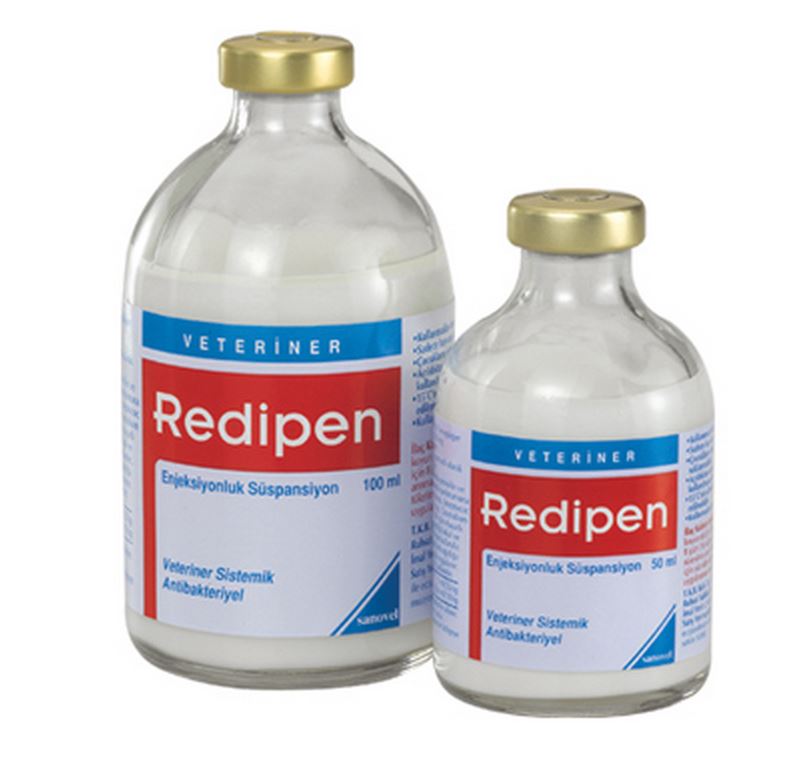 REDİPEN BİLEŞİMİ REDİPEN krem-beyaz renkli akıcı bir süspansiyon olup beher ml'sinde 200.000 IU’ye eşdeğer prokain penisilin G, 250 mg (200 mg dihidrostreptomisin baza eşdeğer) dihidrostreptomisin sülfat ve prezervatif olarak 1 mg metil hidroksibenzoat içerir. FARMAKOLOJİK ÖZELLİKLERİ REDİPEN’in bileşiminde yer alan prokain penisilin G, Penicillium notatum kültürlerinden elde edilen, ß-laktam halkasına sahip dar spektrumlu bir penisilindir. Bakterisidal etkisini bakteri hücre duvarının yapısal eleman olan peptidoglikanla etkileşerek peptidoglikan biyosentezinin son basamağında bulunan enzimlerden transpeptidaz ve DD-carboxypeptidazı inhibe ederek biyosentezini inhibe ederek gösterir. Bakterinin lizisi çoğu zaman, duvarı oluşturan elementler arasındaki bağları hidrolize eden enzimlerin (otolizin, N-asetilmuramil-L-alanin amidaz ve muramidaz) aktivasyonu sonucu meydana gelir. Bir aminoglikozid antibiyotik olan dihidrostreptomisin ise gram negatif bakteri ribozomlarında protein sentezini bozarak etkisini gösterir. Kombinasyon başlıca şu bakterilere etkilidir; Corynebacterium pyogenes, Klebsiella pneumoniae, Listeria sp., Pasteurella haemolytica, P. multocida, Staphylococcus sp., Streptococcus sp., peptostreptococcus sp., Erysipelothrix insidiosa, Clostridium sp., Escherchia coli, Proteus sp., Moraxella sp., Actinobacillus lignieresi, Haemophilus sp., ve Salmonella sp. Prokain penisilin G olarak kas içi yolla verilen penisilin G’nin emilimi nispeten yavaştır; 2-4 g/ml olan en yüksek kan konsantrasyonuna 2-4 saatte ulaşır. Yeterli terapötik konsantrasyonu (0.5 g/ml) ise yaklaşık 24 saat boyunca korur. Dihidrostreptomisin ise kas içi uygulandığında hızla emilir, bir saat içinde en yüksek kan konsantrasyonuna ulaşır. Fötal kana ve amniyotik sıvıya da geçer. Bakteri türüne ve suşa göre değişmekle birlikte, genelde 5 g/ml olan terapötik konsantrasyonunu yaklaşık 12 saat korur. Penisilin G ve dihidrostreptomisin vücuttan yüksek oranda idrarla, daha düşük oranlarda safrayla ve diğer yollarla atılır. ENDİKASYONLARI REDİPEN sığır ve koyunlarda penisilin ve streptomisin kombinasyonunun etki spektrumuna giren Haemophilus sp., Pasteurella sp., Streptococ sp., Salmonella sp., Staphylococ sp., Clostridium sp., Corynebacterium sp. ve E. coli gibi duyarlı pek çok bakterinin meydana getirdiği lokal ve sistemik enfeksiyonların tedavisinde kullanılır. KULLANIM ŞEKLİ VE DOZU REDİPEN Enjektabl Süspansiyon, 100 kg canlı ağırlığa 4 ml (1 kg canlı ağırlığa 8.000 IU prokain penisilin ve 10 mg dihidrostreptomisin) oranında, günde 1 defa olmak üzere 3 gün boyunca kullanılır. Sadece kas içi yolla uygulanır. Hayvan Türü Doz Sığır 4 ml/100 kg Canlı Ağırlık Buzağı 2 ml/50 kg Canlı Ağırlık Koyun - Keçi 1 ml/25 kg Canlı Ağırlık Kuzu - Oğlak 0.4 ml/10 kg Canlı Ağırlık Enjeksiyon sahası temizlenir ve alkolle silinir. Sığırlarda bir bölgeye 20 ml’den fazla uygulanmamalı, artan kısım başka bir bölgeye enjekte edilmelidir. Kullanmadan önce iyice çalkalayınız. İSTENMEYEN/YAN ETKİLERİ Duyarlı hayvanlarda nadiren ürtiker, bulantı, kusma, solunum güçlüğü, anjionörotik ödem, vazomotor merkezi felci ve koma gibi yan etkiler, anafilaktik şok ve ölüm meydan gelebilir. Özellikle böbrek fonksiyon bozukluğu olan hayvanlarda, doza bağlı olarak oluşan streptomisinin yüksek plazma konsantrasyonları nörotoksik, nefrotoksik ve ototoksik etki gösterebilir. Böbrek yetmezliklerinde doz miktarı yeterli düzeye indirilmelidir. İLAÇ ETKİLEŞİMLERİ Antipiretik ve antiromatizmal ilaçlarla (özellikle fenilbutazon ve salisilatlar) birlikte kullanıldığında penisilinin böbrekten atılımı yavaşlayabilir. Bakterisit etki gösteren penisilinler bakteriyostatik antibiyotiklerle (tetrasiklin, sulfonamidler, fenikoller, makrolidler gibi) kombine edilmemelidirler. Bu durumda penisilinin bakterisidal aktivitesi baskılanabilir. Streptomisin muhtemel toksik etkilerinden dolayı, nefrotoksik, ototoksik ve neurotoksik olduğu bilinen ve/veya streptomisin bu etkilerini arttırabilecek diğer ilaçlar ile (diğer aminoglikozidler, furosamid, sulfonamidler, tetrasiklinler, anestezikler, sefalosporinler vs) birlikte kullanılmamalıdır. Ayrıca özellikle yüksek dozlarda olmak üzere, penisilin streptomisin kombinasyonlarının, genel anestezi ve/veya kas gevşetici uygulanmış hayvanlarda kullanılması blokaj etkisini arttırabileceğinden ölümlere neden olabileceği de unutulmamalıdır. DOZ AŞIMINDA BELİRTİLER, TEDBİRLER VE ANTİDOT Önerilen dozlar aşılmamalıdır. Penisilinlere karşı hipersensitivite reaksiyonları lokal şişkinlikten, anaflaksi ve ölüme kadar değişebilmektedir. Bu gibi durumlarda semptomatik tedavi yapılır. GIDALARDA İLAÇ KALINTI UYARILARI İlaç Kalıntı Arınma Süresi (i.k.a.s.): Tedavi süresince ve son ilaç uygulamasından sonra 60 gün geçmeden sığır ve koyunlar kesime gönderilmemelidir. Tedavi süresince ve son ilaç uygulamasından sonra 8 gün (16 sağım) boyunca inek ve koyunlardan elde edilen süt insan tüketimine sunulmamalıdır. Sütteki ilaç kalıntı arınma süresinin uzun olması nedeniyle insan tüketimi için süt elde edilen koyun ve ineklere uygulanması tavsiye edilmez. KONTRENDİKASYONLARI Karaciğer ve böbrek yetmezliği olan ve penisiline alerjik olduğu bilinen hayvanlarda kullanılmamalıdır. Gebelikte kullanım: Streptomisinin fötusa olabilecek nörotoksik, nefrotoksik ve ototoksik etkilerinden dolayı gebe hayvanlarda kullanılmamalıdır. HEDEF OLMAYAN TÜRLER İÇİN UYARI Bütün diğer penisilin içeren ürünlerde olduğu gibi REDİPEN Enjeksiyonluk Süspansiyon oral yada parenteral yolla kullanımı tavşan, kobay, hamster ve Gerbilinae ailesinden kemiriciler gibi küçük laboratuvar hayvanlarında gastrointestinal florayı bozabilir. Bu nedenle bu hayvanlarda kullanılmam