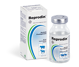 BİLEŞİMİ: Reprodin berrak, renksiz veya açık sarı renkte, kullanıma hazır bir çözeltidir ve beher ml'de 250 µg eşdeğerinde 263 µg kioprostenol sodyum içerir. FARMAKOLOJİK ÖZELLİKLERİ Kioprostenol sentetik bir prostaglandin Fm dinoprost (PGF2a) analoğudur. Kioprostenol prostaglandin F2a gibi corpus luteumu luteolize etme, uterus düz kaslarında kontraksiyon ve serviksi gevşetme etkisine sahiptir. Kioprostenol, corpus luteum üzerindeki luteolitik etkisini, östrus siklusunun luteinizasyon fazında, ovaryumlardaki luteinleştirici hormon (LH) reseptörlerinin miktarını ani olarak düşürerek, progesteron seviyelerinin hızla azalmasına neden olarak ve utero ovaryen venlerde vazokonstriksiyon oluşturulmasını sağlamakla gösterir. Böylece hipofiz bezi ön lobunda FSH hormonunun salgılanması artar ve yeni bir follikül oluşumunu takiben, normal östrus ve ovulasyon sağlanmış olur. Korpus luteum'un lize olmasından hemen sonra progesteron düzeyi hızla düşer ve ardından sığırda 2-4 gün sonra, atta ise 2-5 gün sonra östrus oluşur. Erken dönem korpus luteumu prostaglandin uygulamasına duyarsızdır. Bu dönem sığır ve atta ovülasyondan sonraki 4-5 günlük döneme tekabül eder. Kioprostenol intramüsküler enjeksiyondan sonra hızla organizmaya dağılmaktadır. Sığırda maksimum doku düzeyine uygulamadan 30 dakika sonra erişir. Kioprostenol ortalama olarak aynı düzeyde idrar ve safra ile elimine edilir. Kloprostenol'ün sığırda yanlanma süresi 1,6 saattir. Kioprostenol meme dokusunda birikim yapmaz, uygulanan dozun %0.75'i süt ile elimine edilir. Corpus luteumu ortadan kaldırma ve hızla progesteron seviyesinde düşüşe neden olma özelliğinden dolayı, sığır ve atlarda östrus oluşturma ve östrusu sen kron ize etme amaçlı kullanılır. Kioprostenol, hayvanlarda en yüksek konsantrasyonlarda bulunduğu enjeksiyon bölgesinde ve enjeksiyondan 30 dakika sonra eliminasyon bölgelerinde (karaciğer, böbrek) çok kısa bir yarı ömre sahiptir. Büyük çoğunluğu idrar ve dışkı ile elimine edilirken, sadece çok küçük bir miktar süt ile atılmaktadır. KULLANIM SAHASI/ENDİKASYONLAR Sığırlarda: 1. Normal slkluslu sığırlarda gizil ve saptanamayan östrus durumlarında: Sığırlar normal siklusda olabil iller fakat, ya östrus belirtilerini göstermezler ya da çok kolay fark edilmeyen belirtiler gösterirler. Reprodin enjeksiyonundan önce, corpus luteum'un rektal palpasyonu ile ovaryumlardaki normal siklus aktivitesi tespit edilmelidir. Reprodin uygulamasından sonraki 2-4 gün sonra östrus görülür, bunu kızgınlık anında yapılacak suni tohumlama veya tabiî tohumlama izler. Kızgınlık görülmezse 11 gün sonra tekrar bir enjeksiyon yapılır. Tohumlama ya 72-84. saatler arasında bir kez ya da 72. ve 96. saatlerde iki kez yapılabilir. 2. Östrus siklusunun senkronizasyonu amaçlı: Kontrollü üretimi kolaylaştırmak için, östrus siklusunu sen kron ize etmede değişik uygulama şekilleri vardır: a. Rektal palpasyon ile corpus luteuma sahip olduğu belirlenen sığırlara tek doz Reprodin enjeksiyonu yapılır, östrusa gelen hayvanlara suni tohumlama veya doğal çiftleştirme uygulanır veya enjeksiyondan 72-96 saat sonra suni tohumlama yapılır. b. Çiftlikte istenilen bütün sığırlara Reprodin enjekte edilir ve kızgınlığa gelenler çifti eştiril ir. Kızgınlığa gelmeyenlere 11 gün sonra ikinci bir Reprodin enjeksiyonu yapılır. Hayvanlar 2-4 gün sonra oluşan östrusta tohumlanırlar. c. Çiftliklerde ki tüm sığırlara 11 gün aralıkla iki kez Reprodin enjeksiyonu yapılır. Çiftleştirme ikinci enjeksiyondan 2-4 gün sonra oluşan östrusta gerçekleştirilir. İkinci enjeksiyondan 72 ve 96 saat sonra suni tohumlama uygulanabilir. 3. Doğum sonrası erken dönemde reprodüktif faaliyetleri İyileştirmek İçin rutin kullanım: Doğumu takiben uterus kontraksiyonunu arttırarak involusyonu hızlandırmak amaçlı tek doz veya iki kez Reprodin enjeksiyonu yapılabilir. 4. İstenmeyen gebeliklerin sona erdirilmesi amaçlı (örn. yanlış çiftleştirme): İstenmeyen gebeliklere son vermek (abortus) amaçlı, ineklerde gebeliğin 5-150. günleri arasında uygulanır. Gebeliğin 100. gününden önceki Reprodin uygulaması ile 3-5 gün içinde abort güvenli ve hızlı bir şekilde gerçekleşir. Gebeliğin 100. ve 150. günleri arasındaki abort oluşturulmasında, luteal progesterondan çok plasental progesteronun rolü artacağından, uygulama sonucu değişken olabilir, bu durumda uygulamadan 8 gün sonra abort oluşmamış ise tekrar bir enjeksiyon yapılır. Gebeliğin 150. gününden sonra abort oluşturulmamalıdır. 5. Anormal gebeliklerin sona erdirilmesi amaçlı (örn. mumifiye olmuş fetusun atılması): Fetus ölümleri, fetusun uterus içinde mumifiye olması ile sonuçlanabilir. Gebeliğin hertıangi bir periyodunda Reprodin uygulaması luteolizis sonucu mumifiye olmuş fetusun uterusdan atılmasını ve yine hydramniosis ve hydrallantois gibi plasental sıvıların patolojik artışı sonucu oluşan tehlikelerin uterusun boşaltılması ile önlenmesini sağlar. 6. Normal doğumun başlatılması İçin uygulama: Normal doğumu başlatmak amaçlı sığırlarda gebeliğin 270. gününden sonra uygulandığında 36-48 saat sonra doğum gerçekleşir. 7. Retensio sekundinarium, pyometra ve kronik metritiste uygulama: Bu gibi durumlarda tek bir Reprodin enjeksiyonu ile uterus kontraksiyonu sağlanarak, sonun atılması kolaylaştırılmış ve uterus içindeki sıvılar uzaklaştırılmış olunur. Bu uygulama intrauterin tedaviyi destekler, östrojenin yükselmesi uterus savunma sistemini aktive eder. 8. Luteal kistlerin tedavisi: Kistik ovaryumlar inatçı kalıcı luteal dokular ile bağlantılı olabilirler. Reprodin tedavisi ile etkili bir şekilde bu sorun çözülüp, normal s iki usa geri dönüş sağlanabilir. Tek doz Reprodin enjeksiyonundan 