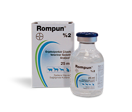 BİLEŞİMİ Rompun % 2 berrak, renksiz, enjeksiyonluk çözelti halinde olup bir ml'sinde 23,32 mg ksilazin hidroklorür ihtiva eder. FARMAKOLOJİK ÖZELLİKLER Rompun ksilazin hidroklorür içerir, ksilazin tiyazin derivatifi olup, sedatif, analjezik, preanestezik ve adele gevşetici etkiye sahip, uykuya benzer (sedatifhipnotik) bir hal oluşturan a2-adrenerjik reseptör agonistidir. Ksilazin beyinde bulunan presinaptik sinir uçlarındaki alfa-2 adrenerjik reseptörleri uyararak noradrenalin, dopamin gibi kateşolaminlerin salınışını engelleyerek ağrı kesici etkisini gösterirken, merkezi sinir sistemindeki interneural iletimlerin önlenmesi suretiyle çizgili kasları gevşetir, bu durum hayvanlarda uyku benzeri bir etki de sağlar. Genel bir adale gevşemesi ve derecesi hayvan cinslerine göre bireysel olarak değişen, ağrı dindirici (analjezi/anestezi) etki de gösterir. Kanın pıhtılaşması üzerinde herhangi bir etkisi yoktur. Evcil hayvanlara I.V. yolla Rompun enjeksiyonundan çok kısa bir süre sonra (1-6 dak sonra) ksilazin vücutta dağılır ve hızlı bir şekilde de vücuttan atılır. Yarılanma süresi yaklaşık 22 - 58 dakikadır. Hızlı bir şekilde meta- bolize olduğundan özellikle sığır doku ve sütünde 2,6-xylidine rastlanmamıştır. Etken maddenin büyük kısmının eliminasyonu 2- 3 saat içinde karaciğerde gerçekleşir, % 70'lik kısmı böbrek vasıtasıyla, % 30'luk kısmı da dışkı ile glikronid bileşikleri halinde dışarı atılır. ENDİKASYONLAR/KULLANIM SAHASI Rompun at, sığır, kedi, köpek ve vahşi hayvanlarda sedatif, analjezik, preanestezik ve adale gevşetici etkiye sahip olduğundan, uykuya benzer (sedatifhipnotik) bir hal oluşturmak için kullanılır. Böylelikle genel bir adale gevşemesi ve derecesi hayvan cinslerine göre bireysel olarak değişen, ağrı dindirici (analjezi/anestezi) bir etki de gösterir. KULLANIM ŞEKLİ VE DOZU Veteriner Hekim tarafından başka şekilde tavsiye edilmediği sürece, SIĞIRLARDA: Sığırlarda ksilazin hidroklorür dozu uygulama amacına ve uygulama yoluna bağlı olarak, 0.02 - 0.34 mg/kg arasında değişmektedir. Pratik olarak aşağıdaki tablodan faydalanabilinir.
