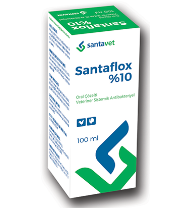 Santaflox %10 Bileşimi: Santaflox %10 Oral Çözelti, 1 ml’sinde 100 mg Enrofloksasin baz içeren, açık sarı renkte, berrak bir çözeltidir. FARMAKOLOJİK ÖZELLİKLERİEnrofloksasin, florokinolonlar grubuna dahil bir anti bakteriyel olup düşük konsantrasyonlarda dahi bakterisit etki oluşturur. Enrofloksasin, bakteriyel DNA sentezinde görevli DNA-giraz enziminin (topoizomerazı II) etkinliğini engelleyerek, bakterisit aktivitesini gösterir. Başlıca duyarlı bakteriler: E.coli, Salmonella spp., Enterobacter spp., Serratia sp., Proteus spp., Klebsiella spp., Shigella spp., Yersinia sp., Moraxella sp., Acinetobacter sp., Actinobacillus sp., Pasteurella sp., Leptospira sp., Campylobacter spp., Citrobacter spp., Haemophilus spp., Ehrlichia sp., Coxiella burnetii, metisiline ve gentamisine dirençli olanlar da dahil Staphylococcus spp., penisiline direçli olanlarda dahil N.gonorrhoeae, N. meningitidis, Corynebacterium spp., Chlamydia sp., V. cholerae, Mycoplasma spp.’dir. Anaerobik kokların çoğu, Clostridium sp., Bacteroides spp. ve Ps. maltophila kinolonlara genellikle az duyarlı veya dirençlidir.