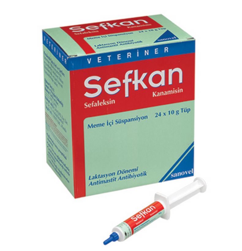 SEFKAN BİLEŞİMİ SEFKAN, açık beyaz, steril, yağlı bir süspansiyon olup beher 10 g’lık tüpte; 200 mg sefaleksin ve 100.000 I.U. kanamisin monosülfat içerir. FARMAKOLOJİK ÖZELLİKLERİ Sefaleksin, başta ß-laktamaz üreten Staph. aureus olmak üzere, gram pozitif koklara ve bazı gram negatif mikroorganizmalara karşı bakterisidal etkili birinci kuşak bir sefalosporindir. Aminoglikozid grubundan bakterisidal bir antibiyotik olan kanamisin ise gram negatif aeroblara özellikle E. coli’ye karşı etkinlik gösterir. Sefaleksin ve kanamisin kombinasyon halinde bulunduklarında gösterdikleri sinerji sayesinde bakterileri inhibe etme güçleri önemli derecede artar. Bu sayede SEFKAN, mastitise yol açan mikroorganizmaların çoğuna karşı geniş bir bakterisidal etki spektrumu sağlar. KONTRENDİKASYONLARI Kanamisin ve/veya Sefaleksine aşırı duyarlılığı bilinen ineklerde kullanılmamalıdır. İSTENMEYEN ETKİLER İlacın tatbikinden sonra bazı lokal doku reaksiyonları görülebilir. Penisilinlerin en önemli yan etkileri akut anafilaksi ve kollapstır. Ayrıca daha az şiddette fakat daha sıklıkla aşırı duyarlılık reaksiyonları (ürtiker, ateş, anjiyonörotik ödem gibi) görülebilir. Anafilaksi oluşursa epinefrin ve/veya oksijen, damar içi (İ.V.) steroid uygulanmalıdır. İLAÇ ETKİLEŞİMLERİ Tetrasiklinler ile birlikte kullanılmamalıdır. GIDALARDA İLAÇ KALINTI UYARILARI İlaç Kalıntı Arınma Süresi (i.k.a.s.):Tedavi süresince ve son ilaç uygulamasından sonra eti için yetiştirilen inekler 7 gün geçmeden kesime gönderilmemelidir. İlaç kullanımı süresince ve kullanımın durdurulmasını takiben 4 gün (8 sağım) süreyle elde edilen inek sütü insan tüketimine sunulmamalıdır. GENEL UYARILAR Kullanmadan önce veteriner hekime danışınız. Çocukların ulaşamayacağı yerlerde saklanmalıdır. Beklenmeyen bir etki görüldüğünde veteriner hekime danışınız. MUHAFAZA ŞARTLARI VE RAF ÖMRÜ 25 °C'nin altında, güneş ışığından uzakta ve dondurulmadan muhafaza edildiği takdirde ilacın raf ömrü 3 yıldır. TİCARİ TAKDİM ŞEKLİ Karton kutu içerisinde 24 adet 10 g’lık beyaz renkli plastik tüplerde sunulmaktadır. |