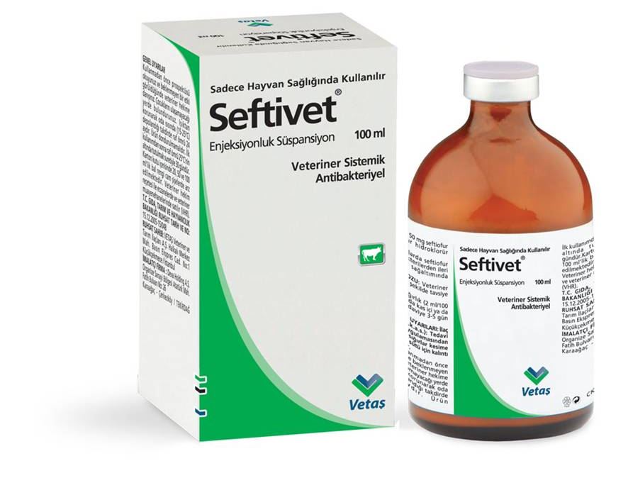 Sadece Hayvan Sağlığında Kullanılır BİLEŞİMİ Seftivet Enjeksiyonluk Süspansiyon; açık sarı renkli, steril ve yağlı enjeksiyonluk bir süspansiyon olup, beher ml’sinde 50 mg seftiofur baza eşdeğer seftiofur hidroklorür bulunur. FARMAKOLOJİK ÖZELLİKLERİ Seftivet Enjeksiyonluk Süspansiyon’un etkin maddesi, geniş spektrumlu, üçüncü kuşak sefalosporin grubu bir antibiyotik olan seftiofur’un hidroklorür tuzudur. Beta-laktamaz üreten bakteriler de dahil olmak üzere bir çok gram-pozitif ve gram-negatif bakteriler üzerinde, bakteri hücre duvarı sentezini inhibe eden hızlı bir bakterisidal etkiye sahiptir. Duyarlılığın yüksek olduğu bakteriler (MIC< 2 µg/ml): Streptococci (enterokoklar hariç), benzyl penisiline duyarlı pek çok gram pozitif bakteriler, E.coli, Klebsiella sp., Proteus sp., Salmonella sp., betalaktamaz üretenler dahil Actinobacillus sp., Haemophilus sp., Pasteurella sp., Clostridium sp. ve Fusobacterium sp. Duyarlılığın orta derecede olduğu bakteriler (MIC< 4 µg/ml): Staphylococcus aureus, bazı Citrobacter sp., Enterobacter sp., bazı Pseudomonas aeruginosa suşları ve Serratia sp. Dirençli bakteriler bakteriler (MIC< 8 µg/ml): Acintobacter sp., Bordetella sp., bazı Enterobacter sp., ve Serratia sp., bazı Pseudomonas aeruginosa suşları, enterococci ve methiciline dirençli Staphylococcus aureus suşları. Seftiofur kas içi uygulamada hızla emilir. Seftiofur ve metabolitleri dozun uygulanmasından ortalama 45 dakika içinde kandaki konsantrasyonu maksimum düzeye ulaşır. Bütün türlerde seftiofur hızla, en etkin metaboliti olan, desfuroylseftiofur’a metabolize olur. Desfuroylseftiofur’un yarı ömrü 10 saattir. Kandaki konsantrasyonu bifazik olarak azalır. Akciğer dokusunda enjeksiyondan 48 saat sonra terapötik düzeyin üzerinde kalır. Uygulamadan sonra 24 saat içinde dozun %95’ten fazlası atılır. Uygulanan dozun %60-80’i idrarla, kalanı da dışkı ile atılır. KULLANIM SAHASI/ENDİKASYONLAR Seftivet Enjeksiyonluk Süspansiyon, Sığırlarda Pasteurella haemolytica, Pasteurella multocida, Haemophylus somnus mikroorganizmalarının görüldüğü solunum yolu hastalıklarında (bovine respiratory disease, shipping fever); Fusobacterium necrophorum, Bacterioides melaninogenicus gibi mikroorganizmalarla karakterize nekrobasillozisin (pododermatitis, ayak çürüğü) sağaltımı ve doğumdan sonra 14 gün içinde E.coli, Arcanobacterium pyogenes necroforum’un neden olduğu akut-post-partum (puerperal) metritis’in sağaltımında kullanılır. KULLANIM ŞEKLİ VE DOZU Veteriner hekim tarafından başka şekilde tavsiye edilmediği takdirde; Seftivet Enjeksiyonluk Süspansiyon için farmakolojik ve günlük pratik doz;