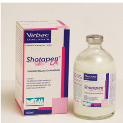 BİLEŞİMİ Shotapen-LA, 1 ml'de 100.000 IU benzatin penisilin G, 100.000 IU prokain penisilin G, 200 mg dihidrostreptomisin baz (sülfat tuzu olarak) içerir. Shotapen-LA Enjeksiyonluk Süspansiyon beyaz renkli enjeksiyona hazır steril bir süspansiyondur. ENDİKASYONU/KULLANIM SAHASI Sığır, koyun, at ve köpeklerde penisilin ve dihidrostreptomisine duyarlı etkenler tarafından oluşturulan solunum, sindirim ve Urogenital sistem enfeksiyonlarında, septisemilerde, viral enfeksiyonlarla beraber seyreden ve duyarlı bakteriler tarafından oluşturulan sekonder enfeksiyonlarda ve diğer yumuşak doku enfeksiyonlarında kullanılır. Bu kapsamda başlıca bulaşıcı Pneomoniler, Actinomycosis, Leptospirosis, buzağı ve kuzu ishalleri, göbek enfeksiyonlarında, ayrıca mastit ve metritlerde lokal tedaviye destek olarak kullanılır. KULLANIM ŞEKLİ VE DOZU Shotapen-LA, kas içi ve deri altı yolla uygulanır. Damar içi yolla uygulanmamalıdır. Uygulamadan önce şişeyi çalkalayarak, süspansiyonu homojen hale getiriniz. Veteriner hekim tarafından başka şekilde tavsiye edilmediği takdirde Shotapen-LA, sığır ve atlara 10 ml/100 kg, buzağı, tay ve koyunlara 1 ml/25 kg doz hesabıyla: Sığır-At (100 kg o.a.) 10 mi Dana-Düve (100 kg c.a.) 10 ml Buzağı-Tay (100 kg c.a.) 5 ml Koyun (30 kg c.a.) 1.5 ml Kuzu (10 kg c.a.) 0.5 ml Köpek (10 kg c.a.) 0.5 ml Genellikle tedavide tek doz yeterli olup, şiddetli vakalarda gerektiğinde 3 gün ara ile Shotapen-LA Enjeksiyonluk Süspansiyon uygulaması tekrarlanabilir. Kullanırken asepsi ve antisepsiye dikkat edilmelidir. Özellikle atlarda olmak üzere aynı bölgeye tekrarlayan enjeksiyonlardan kaçınılmalıdır. |