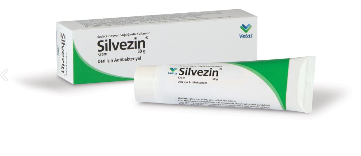 Sadece Hayvan Sağlığında Kullanılır BİLEŞİMİSİLVEZİN Krem, her 1 g’da; 10 mg Silver sulfadiazin içerip, beyaz renkli, hemen hemen kokusuz, su bazlı, yumuşak, homojen bir kremdir.FARMAKOLOJİK ÖZELLİKLERİ SİLVEZİN kremin etkin maddesi silver sülfadiazin, suda erimeyen ama sulu krem bazında homojen bir süspansiyon yapan bir madde olup geniş bir antibakteriyel spektruma sahiptir. Her türlü yanık ve açık yaraların enfeksiyondan korunmasında, yara ve yanıkların tedavisinde başarı ile kullanılmaktadır. Gümüş ile sülfadiazinin kombine olmuş antibakteriyel etkisi, bakteri türlerinde direnç gelişmesini de önlemeye yardım eder. Gümüş ise yavaş biçimde salınır ve buna paralel olarak klorür iyonunun hızlı bir şekilde tüketilmesi önlenir. Böylece elektrolit denge bozuklukları minimum düzeyde kalır. Etkili olduğu mikroorganizmalardan bazıları; Proteus vulgaris, E. coli, Klebsiella pneumonia, Pseudomonas auroginosa, Staphilococcus aureus, Candida albicans ve diğer mantarlar, Streptococcus cinsi mikroorganizmalardır. Yapılan klinik deneylerde bazı enfeksiyonlardan korunmada; tedavi yönünden, hem ağrısız olduğu hem de elektrolit kaybına yol açmayan bir epitelizasyonla iyileşme meydana getirdiği kaydedilmiştir. Yaralara uygulanan SİLVEZİN Krem, emilmekle birlikte dolaşan kana geçen total miktarı dikkate alınmayacak düzeylerde kalır (en fazla %10). Bununla birlikte, uygulanan kesimlerdeki dokular tarafından emilen yoğunluğu yeterli antibakteriyel etkinlik sağlayacak düzeyde olur. SİLVEZİN Krem’in uygulanmasından sonra, gerek görülürse, üzerine pansuman uygulanabilir ve değiştirirken pansuman materyali yaraya yapışmaz. Su ile kolayca yıkanabilir, leke bırakmaz. KULLANIM SAHASI/ENDİKASYONLAR SİLVEZİN Krem tüm hayvanlarda, duyarlı bakterilerin karıştığı her türlü deri lezyonlarında ve yaralarında, yanık yaralarında tedavi amacıyla kullanılır.