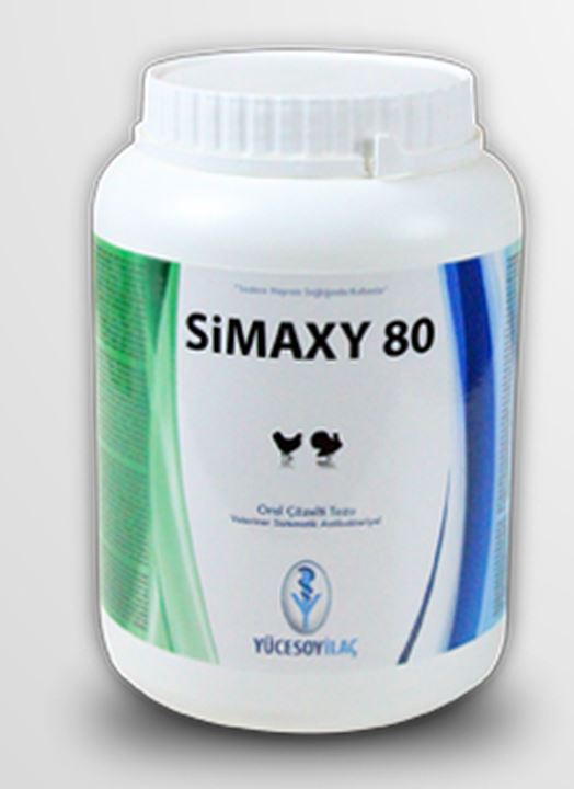 Bileşimi Beyaz, krem renkli tozun her gramı 800 mg Amoksisilin Trihidrat içermektedir. Kullanım Yerleri Amoksisilin etçi tavuk ve hindilerde spektrumuna giren gram pozitif ve gram negatif bakterilerden kaynaklanan enfeksiyonların sağaltımında kullanılır. Kullanım Şekli ve Dozu SİMAXY 80, kanatlı hayvanlarda günlük 20 mg/kg canlı ağırlık/gün dozunda içme suyu yolu ile verilir. Hayvanlar 2 saat susuz bırakılır. Günlük doz 6 saatte içirilir. SİMAXY 80, g/gün = Ortalama canlı ağırlık *Tavuk sayısı 50 (20 mg/kg CA için) veya 100 (10 mg/kg CA için) ilaçla sağaltıma 3-5 gün süreyle devam edilir. Pratik Doz SİMAXY 80, 1000 kg canlı ağırlık için 25 gr dozda kullanılır. |