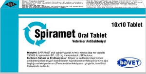 SPİRAMET BİLEŞİMİ SPİRAMET oral tablet yuvarlak kırmızı renkte olup her tablette 750000 IU spiramisin BP, 125 mg metronidazol USP bulunur. FARMAKOLOJİK ÖZELLİKLER SPİRAMET oral tablet spiramisin ve metronidazolun bir araya gelmesi ile iki aktiften oluşan bir antibakteriyel kombinasyonudur. Spiramisin makrolit bir antibiyotik olup, I, II, III diye bilinen karışımından ibarettir. Ağız yoluyla kullanıldığında sindirim kanalından tamama yakını emilip 60 dakikada doruk plazma yoğunluğuna erişir ve 8-12 saat etkili düzeyde kalır. Vücut sıvılarına ve dokulara dağılımı iyi olup akciğerlerde, sindirim kanalında, genital organlarda, bronşiyal sıvılarda yüksek düzeyde bulunur. Diğer makrolitlere nazaran daha yavaş olarak vücuttan atılır ve atılış ağırlıklı olarak safra ile olur. Spiramisin bakteriyostatik etkilidir. Bakterilerde ribozomun 50 S alt ünitelerine bağlanır ve protein sentezini engelleyerek etkiler. Spiramisin Gram pozitif ve Gram negatif bakteriler ile Mycoplasma ve Chlamydia’ lara etkilidir. Başlıca duyarlı bakteriler Staphylococcus sp. (penisilinaz üretenler dahil), Sterptococcus sp., Mycoplasma sp., Pasteurella sp., Haemophilus sp., Bacteriodes sp., Clostridium sp., Brucella sp., Rickettsia sp., Fusobacterium necrophorum, Listeria monocytogenes, Leptospira ictero-hemorragiae, Neisseria intracellularis, Metronidazol ise sentetik nitroimidazol türevi bir antibakteriyeldir. Ağız yoluyla kullanıldığında hızlı ve tamama yakın derecede emilir. Tüm vücut kesimlerine etkili yoğunlukta geçer. Karaciğerde metabolize edilir, büyük ölçüde safra ile atılır. Köpeklerde besinlerle verilmesi halinde emilim artar. Vücuttaki yarı ömrü 4-12 saat arasındadır. Bakterileri DNA sentezini inhibe ederek veya hücrede enerji üretimini bozarak bakterisit olarak etkiler. Metronidazol Bacteriodes sp., Clostiridium sp., Campylobacter sp., Fusobacterium sp. Olamk üzere anaerob bakterilere ve protozoalara (Trichomonas sp., Treponema sp., Histomonas sp., Leishmaniasis sp.) etkilidir. İSTENMEYEN YAN ETKİLER Aşırı salivasyon, öğürme, ağzı pençeleme, mide bulantısı, kusma, azalan iştah görülür. Metronidazolden kaynaklanan ağızda kötü tat bırakma nedeniyle kusma, öğürme, mide bulantısı gibi istenmeyen etkiler gözlenebilir. Nadiren ishal, depresyon, halsizlik, akyuvar sayısında azalma, karaciğer yetmezliği ve idrarda kan görülebilir. İLAÇ ETKİLEŞİMLERİ Diğer makrolit grubu antibiyotiklerle eş zamanlı kullanılmamalıdır. Penisilin, aminoglikozid ve sefalosporinlerle beraber kullanılabilir. DOZ AŞIMINDA BELİRTİLER, TEDBİRLER VE ANTİDOT Uzun süreli, orta ve yüksek dozlu tedavilerde nörolojik belirtiler tedavinin başlamasından 7 ile 12 gün sonra görülebilir. Özel antidotu yoktur. Septomatik tedavi yapılmalıdır. KONTRENDİKASYONLAR Önerilen dozlarda bilinen bir kontrendikasyonu yoktur. Karaciğer ve böbrek yetmezliği bilinen hayvanlarda uzun süreli tedaviler kontrendikedir. Gebelikte kullanım: Gebelikte kullanımı ile ilgili yeterli çalışma yapılmamıştır. Süt veren hayvanlarda kullanılmaz. GENEL UYARILAR Kullanmadan önce veteriner hekime danışınız. Çocukların ulaşamayacağı yerde bulundurunuz. Beklenmeyen bir etki görüldüğünde veteriner hekime danışınız. MUHAFAZA ŞARTLARI VE RAF ÖMRÜ Orijinal ambalajında 25°C nin altında oda ısısında ve kuru yerde saklanmak şartıyla ürünün raf ömrü imal tarihinden itibaren 2 yıldır. TİCARİ TAKDİM ŞEKLİ Karton kutu içinde 10 tablet, 20 tablet, 30 tablet, 40 tablet, 50 tabletlik blister ambalajlarda pazara sunulmuştur. |