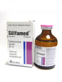 BİLEŞİMİ SULFAMED Enjeksiyonluk Çözelti, berrak saman renginde bir çözelti olup, her ml’sinde 200 mg Sulfadoksin ve 40 mg Trimetoprim içerir. KULLANIM YERİ Sülfamed Enjeksiyonluk Çözelti, sığır, koyun, keçi, at, kedi ve köpeklerin sindirim, solunum, ürogenital sistem enfeksiyonlarının ve lokal enfeksiyonların sağaltımında kullanılır. Bu kapsamda Pasteurella spp.’e bağlı enzootic pneumonilerde, tek başına yada viral enfeksiyonlarla seyreden alt ve üst solunum yolu enfeksiyonlarında, E.coli ve Salmonella’lara bağlı gastroenteritis ve septisemilerde, buzağı difterisinde ve yumuşak doku enfeksiyonlarında kullanılır. KULLANIM ŞEKLİ VE DOZU Veteriner Hekim tarafından başka bir şekilde tavsiye edilmediği takdirde; Farmakolojik doz: 15 mg/kg canlı ağırlık dozda sığırlarda damar içi, kas içi ve deri altı yolla; atlarda damar içi yolla (tercihen yavaş ve vücut ısısına yakın), gerekir ise kas içi yolla; koyun ve keçilerde damar içi ve kas içi yolla; köpek ve kedilerde kas içi yolla uygulanır. Pratik doz: 3 ml/50 kg canlı ağırlık dozda uygulanır. Genellikle tek doz uygulama yeterlidir. Eğer gerek duyulursa 48 saat sonra doz tekrarlanabilir. Kullanırken asepsi ve antisepsiye uyulmalıdır. Enjektör ve iğnenin antisepsisi için alkol ve diğer dezenfektanlar kullanılmamalıdır. |