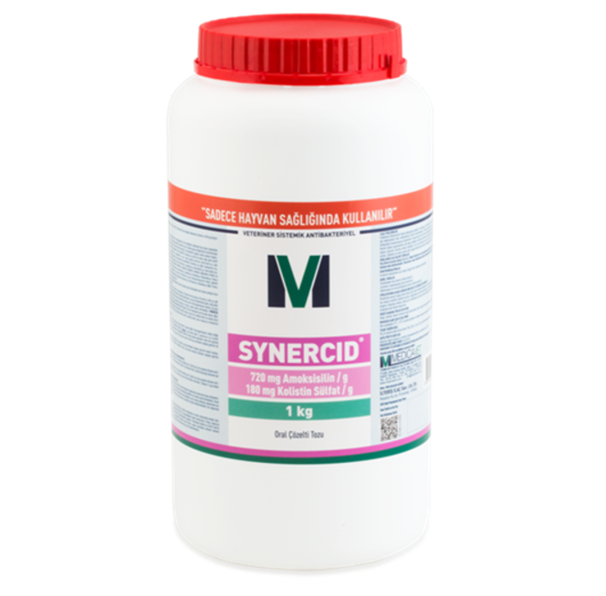 Bileşimi: Endikasyonları: Tavuklarda; E. coli tarafından meydana getirilen kolibasillozis, Pasteurella multocida tarafından meydana getirilen kanatlı kolerası, Haemophilus paragallinarum tarafından meydana getirilen enfeksiyöz coryza, Salmonella enteritidis tarafından meydana getirilen salmonellozis. Farmakolojik Özellikleri: Kolistin ise polimiksin grubu bir polipeptid olup etki mekanizması, hücre zarı yapısına giren fosfolipidlere etki etmek suretiyle hücre duvarının yapısını bozmak suretiyle gerçekleşir. Kolistin; Aerobacter aerogenes, E. coli, Salmonella sp., Shigella sp., Pasteurella sp., Pseudomonas aeruginosa, Brucella sp., Vibrio sp. gibi gram negatif bakteriler üzerinde etkilidir. Amoksisilin ve Kolistinin bir arada kullanılmasının, ayrı ayrı kullanımlarına göre, daha geniş bir spektrumda etkin olduğu kabul edilmektedir. Birlikte kullanım halinde etki alanına giren mikroorganizmaların bazıları Brucella abortus, Neisseria sp., Proteus mirabilis, Klebsiella sp,, Enterobacter aerogenes ve Bacillus subtilis olarak verilmektedir. SYNERCID uygulanmasından sonra, iki antibiyotiğin de gösterdiği farmakokinetik profil farklıdır. Biri hem sistematik hem de lokal olarak, diğeri ise lokal olarak gastrointestinal seviyede faaliyet gösterir. Amoksisilin sindirim sistemi içinde iyi bir şekilde emilir ve süratle vücut sıvılarına ve dokularına yayılır. Vücuttan idrarla atılır. Buna karşılık kolistin zayıf bir şekilde emilir, vücut sıvılarına ve dokularına yayılmaz ve dışkıyla atılır. Ambalaj: 20 gr, 250 gr, 500 gr, 1 kg ve 2.5 kg. |