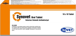 Bileşimi Her tablette 200 mg amoksisiline eşdeğer amoksisilin trihidrat ve 50 mg klavulanik asite eşdeğer potasyum klavulanat içerir. Kullanım sahası/Endikasyonlar SYNOVET oral tablet köpek ve kedilerde amoksisilin-klavulanik asit kombinasyonuna duyarlı bakterilerin oluşturduğu aşağıdaki enfeksiyonların tedavisi için kullanılır.