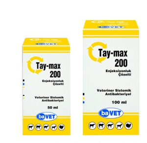 BİLEŞİMİ Her ml’si 200 mg Tilozin içerir. KULLANIM YERİ/ENDİKASYONLAR: Tay-max 200 tilozine duyarlı bakterilerin neden olduğu; sığır, koyun ve keçilerde erken dönemdeki mastitis ve agalaksia, metritis, pododermatitis, piyoderma, keçi ciğer ağrısı, pnömoni, CRD (hindilerde), arthritis, difteri, dizanteri, enteritis başta olmak üzere; solunum sistemi, sindirim sistemi ve yumuşak doku enfeksiyonlarının sağaltımında kullanılır. UYGULAMA ŞEKLİ VE DOZU Veteriner hekim tarafından başka şekilde tavsiye edilmediği takdirde: Ürün tüm türlerde kas içi yolla uygulanır. Günlük parenteral doz 10 mg/kg canlı ağırlık/gündür. Pratik olarak hindiler dışındaki hayvanlara her 20 kg canlı ağırlık için günde 1 ml yeterlidir. Hindilerde ise 5 kg canlı ağırlık için günde yaklaşık 0,3 ml yeterlidir. Sağaltım için genellikle 5-6 günlük uygulama yeterli olup, sığırlarda bir bölgeye uygulanacak azami ilaç miktarı 10 ml, koyun ve keçilerde 5 ml olup, gerektiğinde farklı bölgelere uygulanmalıdır. |