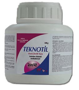 BİLEŞİMİ 1 g’ında 840 mg Tilosin baz’a eşdeğer Tilosin tartarat içerir. KULLANIM YERİ /ENDİKASYONLARI Teknotil Oral Çözelti Tozu, buzağılarda duyarlı bakteriler tarafından meydana getirilen gastrointestinal sistem ve solunum sistemi enfeksiyonlarında, tavuk ve hindilerde solunum sistemi hastalıkları (CRD), enfeksiyöz bronşitis, enfeksiyöz larengotrahitis, enfeksiyöz sinüzitis ve diğer Mycoplasma enfeksiyonları ile Tilosin’e duyarlı mikroorganizmaların neden olduğu enfeksiyonların tedavisinde kullanılır. KULLANIM ŞEKLİ VE DOZU Veteriner hekim tarafından başka şekilde tavsiye edilmediği taktirde; Buzağılara; günde 50 kg canlı ağırlığa / 2 g Teknotil Oral Çözelti Tozu bir miktar içme suyu ile karıştırılarak verilir. |
