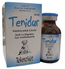 BİLEŞİMİ Her ml’sinde 56.8 mg Prazikuantel içerir. KULLANIM YERİ /ENDİKASYONLARI Tenidur Enjeksiyonluk Çözelti köpek ve kedilerde; Echinococcus granulosus, Echinococcus multilocularis, Dipylidium caninum, Taenia pisiformis, Hydatigena (Taenia) taeniaeformis, Taenia hydatigena, Taenia ovis, Multiceps multiceps, Mesocestoides sp. ve Joyeuxiella pasqualei gibi şeritlerin ergin ve larval formlarının neden olduğu paraziter enfeksiyonların tedavi ve kontrolünde kullanılır. KULLANIM ŞEKLİ VE DOZU Veteriner hekim tarafından başka şekilde tavsiye edilmediği taktirde Tenidur Enjeksiyonluk Çözelti’nin köpek ve kedilerdeki farmakolojik dozu 5,68 mg Prazikuantel / kg canlı ağırlık olup; pratik dozu 1 ml / 10 kg canlı ağırlıktır. Tenidur Enjeksiyonluk Çözelti kas içi (İM) ve deri altı (SC) olarak uygulanır. Pratik doz tablosu Echinococcus enfeksiyonundan şüphe ediliyorsa ilaç mutlaka kas içi (İM) olarak uygulanmalıdır. Bir hayvanda kullanılacak ilaç miktarı 3 ml’yi geçiyorsa ilaç kas içi (İM) veya iki kısma bölünerek iki ayrı yere uygulanmalıdır. |