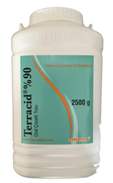 BİLEŞİMİ: TERRACİD %90 Oral Çözelti; sarı renkli, kristal hidroskopik bir tozdur ve beher g.da 900 mg oksitetrasiklin hidroklorür içerir. KULLANIM SAHASI/ENDİKASYONLARI: Kanatlılarda (civciv, piliç, tavuk ve hindilerde): Kronik solunum yolu enfeksiyonları (CRD), kanatlı korizası ve kolerası, diğer bakteıiyel eııteritisler, pullorum, mavi ibik, enfeksiyöz siııovit ve sinüzit. Hindilerde: Erisipel enfeksiyonu. UYGULAMA SEKLİ VE DOZU: Farmakolojik doz: Kanatlılarda günde 30-40 mg/kg C.A./güııdür. Pratik doz: Tavuk ve hindide her 200 kg C.A. için günde 7.5-10 g toz günlük içme suyuna katılarak içirilir. Klinik iyileşme durumuna göre aynı uygulama 3-5 gün süre ile tekrar edilir. Günlük olarak kullanılacak TERRACİD %90 Oral Çözelti Tozunun su tankında homojen bir şekilde karıştırılmasını sağlayabilmek için, önceden 3-5 litre suda çözdürüldükten sonra su tankına aktarılarak yeterince karıştırılması gerekir. İlaçlı su her gün taze olarak hazırlanır. GIDALARDA İLAÇ KALINTI UYARILARI: İlaç kalıntı arınma süresi (i.k.a.s): Tedavi süresince ve ilaç uygulamasından sonra tavuk ve hindiler 14 gün geçmeden kesime sevk edilmemelidir. Tedavi süresince ve son ilaç uygulamasından sonra 14 gün geçmeden elde edilen yumurtalar insan tüketimine suııulmamalıdır. TİCARİ TAKDİM SEKLİ: 1 ve 2.5 kg'lık, Plastik (HDPE) kavoııozlarda kutusuz olarak satışa sunulmuştur. |