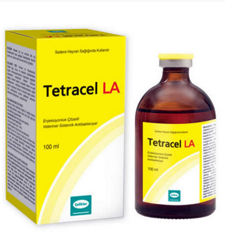 BİLEŞİMİ Tetracel LA her ml’sinde 200 mg Oksitetrasiklin baza eşdeğer Oksitetrasiklin dihidrat içerir. ENDİKASYONLAR Tetracel LA Enjeksiyonluk Çözelti sığır, koyun ve keçilerde Oksitetrasikline duyarlı mikroorganizmaların neden olduğu aşağıdaki hastalıkların tedavisinde kullanılır. Solunum sistemi, sindirim sistemi, ürogenital sistem ve ayak enfeksiyonları, enfeksiyöz keratokonjunktivitis, septik yaralar, operasyon öncesi ve sonrası oluşan yaralar, viral enfeksiyonlar sonrası şekillenen sekonder bakteriyel enfeksiyonlar, anaplazmosis. KULLANIM ŞEKLİ VE DOZU Veteriner hekim tarafından başka bir şekilde tavsiye edilmediği takdirde; sadece derin kas içi (i.m.)yolla uygulanmalıdır. Farmakolojik doz: 20 mg/kg canlı ağırlıktır. Pratik doz: 10 kg canlı ağırlık için 1 ml’dir. Gerekli hallerde 3 gün sonra doz tekrarlanır. Sığırlar için 20 ml, koyun ve keçi için 5 ml’den daha fazla kullanılması gerektiğinde toplam miktar bölünerek iki ayrı yere enjekte edilmelidir. Kesinlikle damar içi yolla uygulanmamalıdır. |