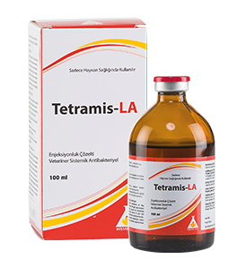 BİLEŞİMİ Her ml’de 200 mg Oksitetrasiklin baza eşdeğer, 215 mg Oksitetrasiklin dihidrat içerir. KULLANIM SAHASI/ ENDİKASYONLAR Tetramis LA sığır, koyun ve keçilerde oksitetrasikline duyarlı mikroorganizmaların neden olduğu pneumoni , leptospirozis, ayak çürüğü , listeriosis, naplasmosis enfeksiyonları, septisemi ,enfeksiyöz keratokonjuktivitis , enteritis, mastitis ve metritis, ayrıca viral enfeksiyonlarla beraber seyreden ve duyarlı bakteriler tarafından meydana getirilen sekonder enfeksiyonların tedavisinde kullanılır. KULLANIM ŞEKLİ VE DOZU Sığırlar için 20 ml, koyun ve keçiler için de 5 ml’ den daha fazla kullanılması gerektiğinde toplam miktarın bölünerek, birden fazla bölgeye enjekte edilmesi önerilir. Farmakolojik Doz: Sığır, koyun ve keçilerde 20 mg /kg CA |