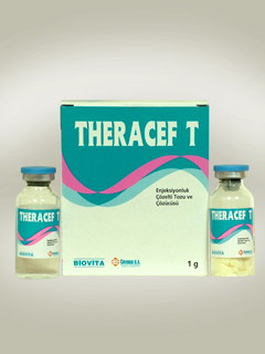THERACEF T BİLEŞİMİ 1 g seftiofura eşdeğer seftiofur sodyum tozu içeren şeffaf flakon 20 ml enjeksiyonluk su içeren şeffaf flakon ve 4 g seftiofura eşdeğer seftiofur sodyum tozu içeren şeffaf flakon 80 ml enjeksiyonluk su ile birlikte satışa sunulmuştur. Süspansiyon halindeki ürünün beher ml’si 50 mg seftiofura eşdeğer miktarda seftiofur sodyum içerir. KULLANIM SAHASI/ENDİKASYONLARI Sığırlarda; Pasteurella haemolytica, Pasteurella multocida ve Haemophilus somnus başta olmak üzere, seftiofura duyarlı bakterilerin oluşturduğu solunum sistemi enfeksiyonlarının, atlarda; ise Streptococcus zooepidemicus’un sebep olduğu solunum sistemi enfeksiyonlarının tedavisi amacıyla kullanılır. KULLANIM ŞEKLİ VE DOZU Veteriner Hekim tarafından başka şekilde tavsiye edilmediği takdirde; Çözelti haline getirilmiş Theracef T’nin farmakolojik dozu: Sığırlar için 1 mg/kg canlı ağırlık./gün, atlar için ise 2 mg/kg canlı ağırlık / gündür. Sadece derin kas içi yolla uygulanmalıdır. Sığırlarda uygulamaya 3 gün devam edilir, sonuç alınamadığı takdirde, tedavi 2 gün daha uzatılmalıdır. Atlarda ise, semptomlar kaybolduktan sonra 2 uygulama daha yapılmalıdır. Atlarda tedavi süresi 10 günü aşmamalıdır. Pratik dozu: Sığırlar için 1 ml/50 kg canlı ağırlık / gün, atlar için 2 ml/50 kg canlı ağırlık / gündür. GEBELİKTE KULLANIM Sefalosporinlerin plasentayı geçtikleri bilinmektedir, ancak gebe fare ve ratlarda yapılan çalışmalarda fötusta herhangi bir teratojenik etkiye rastlanmamıştır. Gebe sığır ve atlarda spesifik çalışma yapılmamıştır. GIDALARDA İLAÇ KALINTILARI HAKKINDA UYARILAR İlaç Kalıntı Arınma Süresı (i.k.a.s); Tedavi süresince ve son ilaç uygulamasından sonra eti için yetiştirilen sığırlar 7 gün geçmeden kesime gönderilmemelidir. Süt veren ineklerde sütte ilaç kalıntı arınma süresi, “0” (sıfır) gündür. TİCARİ TAKDİM ŞEKLİ 1 gram seftiofur toz (seftiofur Na şeklinde) içeren flakon (20 ml enjeksiyonluk su ile birlikte), 4 gram seftiofur toz (seftiofur Na şeklinde) içeren flakon (80 ml enjeksiyonluk su ile birlikte) karton kutu içinde satışa sunulmuştur. |