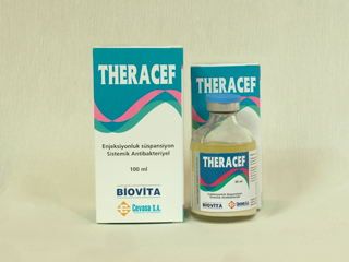THERACEF BİLEŞİMİ Theracef Enjeksiyonluk Süspansiyon, beyaz renkli akışkan ve beher ml’de 50 mg seftiofura eşdeğer miktarda seftiofur hidroklorid içeren bir süspansiyondur. KULLANIM SAHASI / ENDİKASYONLAR Sığırlarda Pasteurella Haemolytica, Pasteurella Multocida ve Haemophilus Somnus başta olmak üzere, Seftiofura duyarlı bakterilerin oluşturduğu solunum sistemi enfeksiyonları ve sığırlarda ayrıca; Fusobacterium Necrophorum ve Bacteroides Melaninogenicus’tan kaynaklanan akut bovin interdigital nekrobasilloz (foot rot, pododermatit), atlarda ise Streptococcus Zooepidemicus’un sebep olduğu solunum sistemi enfeksiyonlarının tedavisi amacıyla kullanılır. KULLANIM ŞEKLİ VE DOZU Veteriner hekim tarafından başka şekilde tavsiye edilmediği takdirde; Theracef’in günlük dozu sığırlar için 1 mg/kg c.a., atlar için 2.2-4.4 mg/kg c.a. , köpekler için 2.2 mg/kg c.a. dır. Uygulama, sığır ve atlara kasiçi veya derialtı yolla yapılmalı ve tedaviye 3 gün devam edilmelidir, sonuç alınmadığı takdirde tedavi süresi 2 gün daha uzatılabilir. Köpeklerde ise uygulama derialtı yolla yapılmalı ve 5-6 gün sürdürülmelidir. Pratik Doz Tablosu: