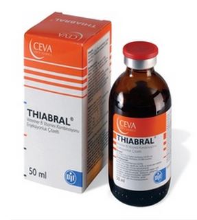 BİLEŞİMİ 50 ml'de 5,75 g Tiamin klorhidrat (Vit B1) ve 0,550 g Piridoksin klorhidrat (Vit B6) bulunur. ENDİKASYONLARI Thiabral; Serebrokortikal Nekroz (CCN) Melas, mısır silajı, eğrelti otu, küflü ve bozuk yem tüketimi sırasında görülen sinirsel bozukluklarda Gastrointestinal hastalıklarda Nedeni belli olmayan sinirsel bozukluklar, iştahsızlık, gelişmede yavaşlama, yürüyüş bozuklukları, epileptoid nöbetler, genel zayıflık halleri gibi durumlarda kullanılır. KULLANIM ŞEKLİ VE DOZU Veteriner hekim tarafından başka şekilde tavsiye edilmediği takdirde; 20 kg canlı ağırlığa 1 ml Thiabral hesabıyla; Sığır - At : 10 - 20 ml Buzağı - Tay : 1 - 5 ml Koyun - Keçi : 1 - 2 ml Köpek ve Kedi : 0,2 - 0,5 ml Kas içi (IM) veya yavaş damar içi (IV) yolla uygulanır. |
