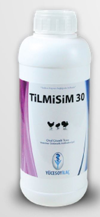 Bileşimi Her mL’sinde 300 mg tilmikosine eşdeğer Tilmikosin Fosfat içeren açık sarı renkte çözeltidir. Kullanım Yerleri Etçi tavuk ve hindilerde Mycoplasmagallisepticum, Mycoplasmasynovia, Ornithobacteriumrhinotracheale, Pasteurellamultocida ve tilmikosine duyarlı diğer mikroorganizmaların yol açtığı solunum yolu enfeksiyonlarının tedavisinde kullanılır. Kullanım Şekli ve Dozu Veteriner hekim tarafından başka bir şekilde tavsiye edilmediği taktirde farmolojik doz: Tilmikosinin etçi tavuk ve hindilerde günlük dozu 15-20 mg/kg canlı ağırlık olarak hesaplanarak içme suyuna ilave edilir. Pratik Doz 1000 kg canlı ağırlık için 50-70 mL Tilmisim 30 içme suyuna karıştırılarak günlük doz olarak verilir.Uygulamaya 3 gün devam edilir.İlaçlı su her gün taze olarak hazırlanmalıdır.Tedavi sırasında önerilen dozlar aşılmamalıdır. |