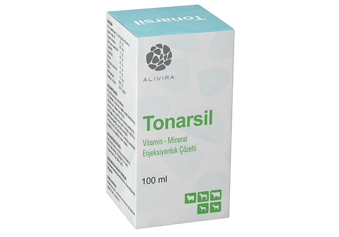TONARSİL BILEŞIMI Asetil metiyonin 50 mg FARMAKOLOJİK ÖZELLİKLERİ Metiyonin karaciğer hücrelerinin korunmasında , kolin ve kreatin sentezinde esansiyel bir amino asittir.Süt sentezinde de görev almaktadır.Sinir sisteminin çalışmasında ve kan hücrelerinin dokusunun korunmasında önemli olan fosfolipitlerin sentezinde rolu vardır.Methionine emildikten sonra metil vericisi olarak davranan S-adenosyl methionine dönüşür.Karaciğerde metabolize olan methionine bileşikleri idrarla atılır. Vitamin B1 temel olarak Krebs çemberinin işleyişinde Asetil koenzim A kaynaklı yağ asitlerinin sentezine katılarak görev alır.Vitamin B1 eksikliği veya artan ihtiyacın karşılanamaması glikolizde aksamaya dolayısıyla kanda piruvik asit birikmesine yol açar. Aynı zamanda neuronların faaliyetinde esansiyel olan yağ asidi sentezi aksayacağından ciddi muskuler ve neural bozukluklar ortaya çıkar. Vitamin B1 şekerlerin metabolizmasinda önemli rol oynayan bir çok enzim sisteminin yardımcı- enzimi olarak iş görür. Bu enzimler piruvik asit ve alfa-ketoglutarik asit gibi alfa-keto asitlerin dekarboksillenmesi ve pentozun hekzoz monofosfat yolunda kullanılmasını saglarlar Vitamin B6 amino asit, yağ asitleri ve karbonhidrat metabolizmasında birçok enzimin koenzimi olarak çalışır.Yemde proteinli maddelerin yükselmesi organizmada Vitamin B6 ihtiyacının da yükselmesine neden olmaktadır. Vitamin B6n emildikten sonra pridoksala çevrilerek yardımcı-enzimlerin şekillenmesinde kullanılır. Her üç şeklinin de en önemli atılma ürünü olan 4-pridoksil asit aldehid oksidazın serbest pridoksala etkisiyle karaciğerde şekillenir ve idrarla atılır. Vitamin B12 kemik iliğinde alyuvar yapımı ile ilgili hücrelerin gelişme , çoğalma ve fonksiyonlarını sürdürebilmeleri için gereklidir.Buradaki işlevi proteinlerin asimilasyonunun sağlanması ve amino asitlerden sentez edilmesidir. Biotin amino asit metabolizmasında yer alan bazı enzimlerin koenzimi olarak çalışır.Eksikliğinde deri ve iskelet sisteminde bozukluklar ve karaciğer ve böbreğin yağlanması ile ilgili sorunlar ortaya çıkar. Epidermik dokuların yapısının gelişmesi, kemik dokusunun normal gelişimi ve üreme potansiyelinde etkilidir. Niacin (VitaminPP) enerji metabolizmasında kritik öneme sahip (N.A.D ve N.A.D.P ) koenzimlerin oluşumunda ve kan damarlarının korunmasında rol almaktadır. Niacinparenteral uygulama yerlerinden iyi emilir.Tüm vücut dokularına dağılır ve sağıtım dozlarında verildiklerinde,idrarla küçük miktarlarda değişmemiş halde çıkarılır. Kalsiyum pantptenat koenzim A'nın yapısına girerek yağ asitleri, kolesterol , steroid hormonlar safra asitleri, asetikolin ve birçok mukoplisakkaritin sentezine katılır. Bağdoku , kartilago ve iskelet elemanlarının meydana gelmesinde önem taşır. Pantotenik asit ayrıca kanatlılarda karaciğerdeki yağ dejenerasyonunun önlenmesinde görev alır .Emilen pantotenik asit tüm vücuda dağılır ve yaklaşık %70'i değişmemiş halde idrarla atılır.B grubu vitaminler daha çok karaciğer ve dalakta depolanır . Bakır organizmanın birçok enzimatik faaliyetinde koenzim olarak veya aktivatör halinde rol alan bir bileşiktir. Enerji ve protein metabolizmasındaki aktivasyonu hemoglobin, keratin, melanin ,serobrosit , myelin ve proteinik kemik matrikslerinin oluşumunda önemlidir. Dolaşıma geçen bakır karaciğer tarafından tutulur ve bazı doku proteinlerine karışır. Plazmada bulunan bakırın çoğu seruloplazmin diye bilinen bir alfa-globulin oksidaz şeklindedir. Demir hemoglobin molekülünün merkez elementidir.Özellikle genç hayvanlarda görülen laktoza dayalı ve demir eksikliği görülen beslenmelerde yarar sağlamaktadır. Selenyum hücre yapısında ve mebranlarda koruyucu görevi olan glutathione peroxidase enziminin yapısında bulunur.Selenyum eksikliği halinde bu koruma ortadan kalkar ve öncelikle kas lifleri amyloidosis etkisi ile fonksiyonlarını kaybetmeye başlar. Selenyum vücudu büyük ölçüde idrarla terkeder. ÖZEL KLİNİK BİLGİLER VE HEDEF TÜRLER İÇİN UYARILAR • İntravenöz serumlarla birlikte verilebilir. • Yarış atlarında uygulamanın yarıştan 24 saat önce yapılması önerilir. • 10 ml.yi aşan kasiçi enjeksiyonlar değişik bölgelere yapılmalıdır • Damariçi enjeksiyonlar vucut ısısında ve yavaş yapılmalıdır. • Demir preparatlarının sığırlardaki yan etjkileri doz aşımı ile ilgilidir ve ölüm görülebilir. • Vucuttan demir atılımı veya parçalanması ile ilgili etkin bir mekanizma mevcut olmadığından , parenteral demir preparatlarını kullanırken doz aşımına yol açmamaya özen gösterilmelidir. • Bazı hayvanlarda selenyum hassasiyeti olabilir.Bu yüzden uygulama öncesi test doz yapılmalıdır. Duyarlı hayvanlara 2 gün boyunca yarı doz uygulanabilir.Selenyum zehirli bir madde olduğundan terapötik dozlar aşılmamalıdır. İSTENMEYEN YAN ETKİLER