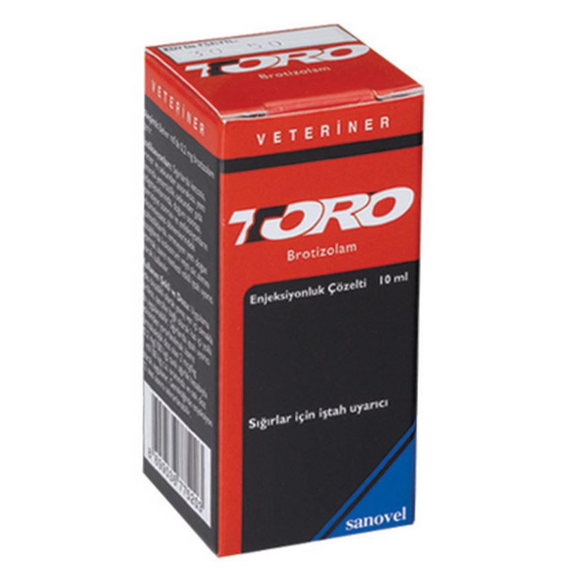 TORO BİLEŞİMİ TORO Enjeksiyonluk Çözelti, partikül içermeyen renksiz, berrak, steril bir çözelti olup beher ml’sinde 0,2 mg brotizolam içerir. FARMAKOLOJİK ÖZELLİKLER TORO Enjeksiyonluk Çözelti’nin etkin maddesi olan brotizolam triazolo-1,4- thianodiazepine kimyasal yapısında, benzodiazepin derivatı, antikonvülzan, kas gevşetici, sedatif ve hipnotik etkilere sahip bir ilaçtır. Brotizolam doza bağımlı olarak sekunder oreksijenik etkiye sahiptir. Bu etkisi merkezi sinir sisteminde iştahtan sorumlu olan hipotalamustaki ventromedial merkezin direkt olarak uyarılması ve buradaki tokluk merkezinin baskılanması ile oluşmaktadır. Belirtilen etkisini beyindeki GABA (Gama Amino Butirik Asit) konsantrasyonunu artırarak gösterir. Oral yada diğer yollardan uygulanan brotizolam hızla emilmekte ve kas içi uygulamadan 30 dakika sonra pik plazma konsantrasyonuna ulaşmaktadır. Vücuda uygulanan ilaç yaklaşık 3 saatlik bir yarı ömür ile elimine edilmektedir. İntravenöz uygulama sonrası yarı ömrü ise bifazik bir plazma kinetiğine sahiptir. Birinci fazda yarı ömrü 0,5 – 1,2 saattir, uygulamadan üç saat sonra başlayan ikinci fazda ise daha yavaş elimine olur ve yarı ömür 5 saattir. Sığırlarda uygulanan dozun ekskresyonu hızlı ve çoğunlukla dışkı yoluyla olmaktadır. Ven içi uygulamadan sonraki ilk bir gün içerisinde dozun % 70’i dışkı ile % 20 ve üzerindeki oranda idrar yoluyla atılmaktadır. Atılım pratik olarak 6 gün sonra tamamlanmaktadır. Metabolitleri ana bileşikten daha az potent olan brotizolam vücutta çok hızlı bir şekilde metabolize edilir. Biyotransformasyonu başlıca hidroksilasyon ve konjugasyon yoluyla şekillenir. ENDİKASYONLARI TORO Enjeksiyonluk Çözelti, sığırlarda ketozis, primer ve sekunder anoreksia, yem alımında yetersizlik, sekunder gıda indigesyonları, doğum sonrası, operasyon sonrası ve enfeksiyonların rekonvalesans dönemleri gibi iştahsızlık durumlarında ve emmeyen yeni doğan buzağılarda kolostrum veya süt alımını uyarmak üzere merkezi etkili iştah uyarıcı olarak kullanılır. KULLANIM ŞEKLİ VE DOZU Uygulama yolu öncelikli olarak yavaş ven içi olmakla birlikte, tercihe bağlı olarak kas içi yolla da uygulanabilir. TORO Enjeksiyonluk Çözelti sığırlarda iştah uyarıcı etkisinden yararlanılmak üzere farmakolojik doz olan 2 mcg/kg (0,2 mg/100 kg) canlı ağırlık hesabıyla 1 ml / 100 kg c.a. oranında ve tek doz olarak uygulanır. Düşük kondüsyondaki hayvanlarda, buzağı ve danalarda hayvanın durumu göz önünde bulundurularak farmakolojik doz 0,15 mg/100 kg canlı ağırlığa (0,75 ml / 100 kg c.a.) kadar düşürülebilir. Pratik doz tablosu: Canlı ağırlık (kg) Dozu (1 ml/ 100 kg) Uygulama yolu Buzağı -Dana 25 – 50 0.25 – 0.5 ml Yavaş İV, İM 50 – 100 0.5 – 1 ml Yavaş İV, İM Sığır 100 – 200 1 – 2 ml Yavaş İV, İM 200 – 400 2 – 4 ml Yavaş İV, İM TORO Enjeksiyonluk Çözelti tek doz olarak uygulanır. Gerektiğinde enjeksiyon 12 saat sonra tekrarlanabilir. ÖZEL KLİNİK BİLGİLER VE HEDEF TÜRLER İÇİN ÖZEL UYARILAR Hasta hayvanlarda iştahsızlığa neden olabilecek diğer nedenler de araştırılarak bu yönde sağaltım kombinasyonları dikkate alınmalıdır. Brotizolamın iştah uyarıcı etkisi dozuna bağlıdır ve 2-8 mcg/kg canlı ağırlık dozunda elde edilebilmektedir. Bu dozdan daha yüksek dozlar, sedasyon, uyku hali ve motor koordinasyon kaybı ile sonuçlanmaktadır. TORO Enjeksiyonluk Çözelti sadece belirtilen endikasyon alanlarında tedavi amaçlı kullanılmalıdır. İSTENMEYEN / YAN ETKİLERİ Özellikle hızlı damar içi uygulamadan hemen sonra geçici bir sedasyon görülebilir. Hızlı enjeksiyon geçici bir kollapsa neden olabilir. Nadiren olsa da duyarlı hayvanlarda alerjik etkileri olabileceği bildirilmektedir. İlacın kesilmesi ile semptomlar kendiliğinden ortadan kalkar. İLAÇ ETKİLEŞİMLERİ TORO Enjeksiyonluk Çözelti diğer merkezi sinir sistemi depresanları (barbitüratlar, narkotikler, anestetikler) ile kullanıldığında aditif etki görülebilir. Ketakonazol, itrakonazol, propranolol, eritromisin, izoniazid ve valproik asit ile birlikte kullanıldığında benzodiazepinlerin metabolizması azalabilir ve aşırı sedasyon görülebilir. Rifampin hepatik mikrozomal enzimleri indükleyebilir ve benzodiazepinlerin farmakolojik etkisini azaltabilir. DOZ AŞIMINDA BELİRTİLER, TEDBİRLER VE ANTİDOT Hafif doz aşımında yada zayıf kondüsyonlu hayvanlarda genel sağlık durumuna bağlı olarak geçici bir sedasyon görülebilir. Genellikle bu geçici sedasyon halinin ortadan kaybolmasını takiben iştah uyarım etkisi devreye girmektedir. Özel bir antidotu olmamakla birlikte doz aşımı durumlarında genel benzodiazepin antagonisti olan flumazenil denenebilir. GIDALARDA İLAÇ KALINTI UYARILARI İlaç Kalıntı Arınma Süresi (i.k.a.s.): Sığırlarda et ve süt için ilaç kalıntı arınma süresi “0” sıfır gündür. KONTRENDİKASYONLARI TORO Enjeksiyonluk Çözelti gıda alımının zararlı olabileceği klinik hastalık durumlarında kullanılmamalıdır. Önerilen doz ve kullanım yolu haricinde kullanılmaz. Gebelikte kullanım: Gebelikte kullanımın güvenilirliğine dair yeterli kanıt bulunmadığından kullanılmaz. GENEL UYARILAR Kullanmadan önce veteriner hekime danışınız. Çocukların ulaşamayacağı yerlerde saklanmalıdır. Beklenmeyen bir etki görüldüğünde veteriner hekime danışınız. UYGULAYICININ ALMASI GEREKEN ÖNLEMLER VE HEKİMLER İÇİN UYARILAR Veteriner hekimler kazara kendilerine enjeksiyona karşı dikkatli olmalıdır. Böyle bir durum söz konusu olduğunda reçete ile hekime müracaat edilmelidir. MUHAFAZA ŞARTLARI VE RAF ÖMRÜ 25°C'nin altında ve direkt güneş ışığından uzakta muhafaza edildiği takdirde raf ömrü 2 yıldır. TİCARİ TAKDİM ŞEKLİ Karton kutu içinde 10, 20, ve 50 ml