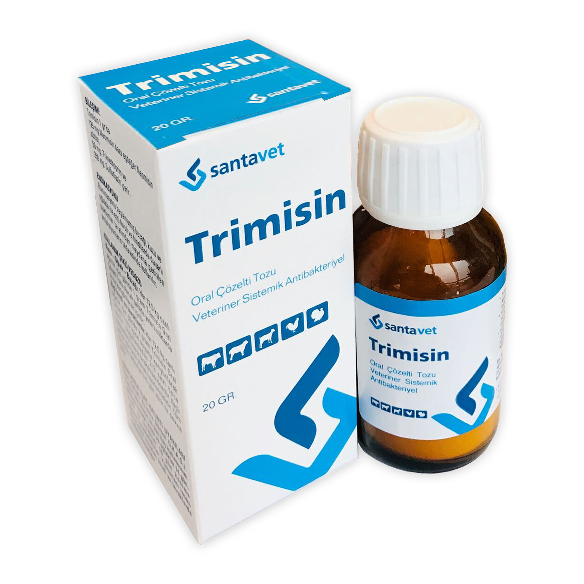 -Gram pozitif aeroblar: Staphylococcus aureus, Streptococcus sp., Actimomyces spp., Corynebacterium sp., Listeria monocytogenes, Erysipelothrix rhusiopathie, Rickettsia sp., Leptospira sp., Pseudomanas aeroginosa, Mycoplasma sp. dirençli olarak kabul edilir. Ricketsia, Leptospira, Mykoplazma türleri ve Pseudomonas aeroginosa’ya etkisizdir. Neomisin ise aminoglikozld bir antibakteriyel olup bakterilerde protein sentezini engellemek suretiyle etkili olur. Neomisin başlıca gram negatif bakterilere (E.coli, Enterobacter aerogenes, Pasteurella spp., Pr vulgaris, Salmonella spp., Shigella spp., H.influenza, N.meningiditis, Vibrio cholerae,) ve bazı gram pozitif bakterilere (Staph. aureus, Strep. Faecalis) karşı etkilidir. Klebsîella sp, E.coli, Pseudomonas sp.’lerin duyarlılığı nispeten azdır. Strep. pyogenes, viridans grubu streptokoklar dirençlidir. Trîmetoprim ve sulfadiazin ağız yoluyla birlikte verildiklerinde sindirim kanalında iyi emilirler ve 1-4 saat içinde plazma doruk değerine ulaşırlar. Fler iki madde de büyük ölçüde idrarla atılırlar. Neomisin ağızdan verildikten sonra, sindirim kanalından son derece sınırlı olarak emilir ve %97’si değişmemiş halde dışkı ile atılır. KULLANIM YERİ /ENDİKASYONLARIRuminasyonu başlamamış buzağı, kuzu ve oğlaklarda; duyarlı bakterilerin neden olduğu pnömoni, bronşitis, nefritis, göbek kordonu iltihabı, Salmonella ve Vibrio türlerinin bakteriyel enteritler, diğer yumuşak doku hastalıkların tedavisinde, Trimisin KULLANIM ŞEKLİ VE DOZU