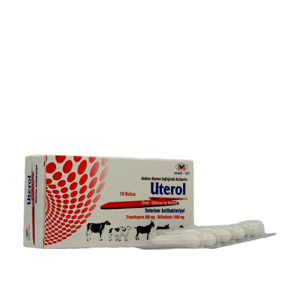 Uterol Oral-Uterus İci Bolus Veteriner Antibakteriyel Bir tablette; 200 mg. Trimethoprim, 1000 mg. Sülfadiazin ihtiva eder. |