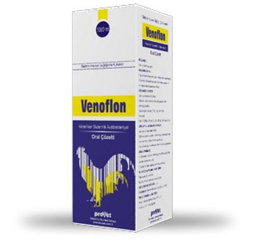 BİLEŞİMİ Her ml.si 100 mg Florfenikol içerir. KULLANIM SAHASI / ENDİKASYONLARI Etçi tavuklarda florfenikole duyarlı bakterilerden kaynaklanan ; Solunum sistemi enfeksiyonları, hava kesesi yangısı ve Koliseptisemisi tedavisinde kullanılır. KULLANIM ŞEKLİ VE DOZU İçme suyuna katılarak kullanılır. Veteriner hekim tarafından başka bir şekilde tavsiye edilmediği takdirde ; Genel farmakolojik doz : 20 mg / kg canlı ağırlık / gündür. Buna göre 100 kg canlı ağırlık için günde 20 ml Venoflon Oral Çözelti günlük içme suyuna katılır. Tedavi 3-5 gün devam eder. |