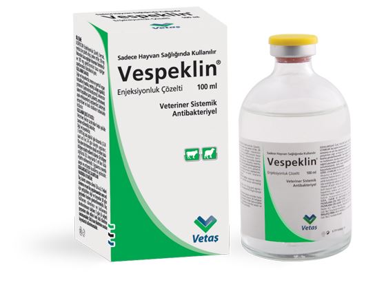 VESPEKLİN BİLEŞİMİ: VESPEKLİN Enjeksiyonluk Çözelti, berrak, renksiz bir çözelti olup, beher ml'de; 50 mg linkomisin baza eşdeğer linkomisin hidroklorür ve 100 mg spektinomisin baza eşdeğer spektinomisin hidroklorür içerir. FARMAKOLOJİK ÖZELİKLERİ: Linkomisin, Streptomyces lincolnensisten elde edilen, linkozamitler sınıfına ait bir antibiyotiktir. 50 S ribozomal alt ünitelere etkiyerek, bakteriyel protein sentezini inhibe eder. Linkomisin özellikle gram pozitiflere etkili olup, Bacillus sp., Corynebacterium sp., Erysipelothrix rhusiopathiae, Stapylococcus sp., Streptococcus sp. (Enterococcus sp hariç), Campylobacter sp., Actinomyces sp., Bacteroides sp. (Bac. fragilis de dahil), Clostridium perfiringes (diğer Clostridium sp hariç), Fusobacteirum sp., anaerobik koklar duyarlıdır. Tüm gram negatif çubuklar, Nocardia spp., Mycobacterium spp. ise dirençlidir. Spektinomisin ise, Streptomyces flavopersicus'tan elde edilen, aminoglikozit grubundan bir antibiyotiktir. 30 S ribozomal alt ünitelere etkiyerek bakteriyel protein sentezini inhibe eder ve bakteriyostatik etki yaratır. Başlıca gram negatiflere etkilidir. Ayrıca bazı gram pozitif bakterilere de etkir. Başlıca Mycoplasma gallisepticum, M. meleagridis, M. synoviae, E.coli, P.multocida, Salmonella sp., N.gonorrhoeoa, Shigella sp., Strep. pneumonia, Strep. pyogenes'e etkilidir. Anaerobik bakteriler ve Pseudomonas sp. dirençlidir. Linkomisin organ ve dokulara etkin bir şekilde dağılır ve bu nedenle de organ ve dokulardaki konsantrasyonu kandakinden daha fazladır. Linkomisin, enjeksiyon bölgesinden hızla emilir ve 30 dk içinde doruk seviyeye ulaşır. Yarılanma ömrü, 3-6 saat arasında değişmekte, plazmada ise, 6-8 saat süreyle etkili yoğunlukta kalmaktadır. İlaç, süte de geçer, sütteki seviyesi plazma seviyesinin 4-7 katına ulaşabilir ve 6-8 saat etkin yoğunluklarda bulunur. Linkomisinin emilen miktarının yaklaşık %'ü, karaciğerden safraya salgılanarak, ve geriye kalanın %40'ı dışkı, %50 kadarı da idrarla atılır. Spektinomisin, enjeksiyon bölgesinden hızla emilir ve 60 dk içinde doruk seviyeye ulaşır. Dolaşımda, plazma proteinlerine fazla bağlanmamakla beraber, ilacın dokulardaki seviyesi, plazma yoğunluğundan düşüktür. Spektinomisin, değişmemiş halde idrarla atılır. Bu kombinasyonun minimum inhibitör konsantrasyonu, her iki etken maddenin tek tek kullanıldığı durumdaki minimum inhibitör konsantrasyonuna göre önemli ölçüde düşüktür. İSTENMEYEN/YAN ETKİLER: Linkomisinin süt ineklerinde ketozise neden olduğu bildirilmiştir. Bazı hayvanlarda aşırı duyarlılık reaksiyonları ortaya çıkabilir. Spektinomisine bağlı olarak ürtiker, titreme, ateş, mide bulantısı görülebilir. Linkomisine bağlı olarak yalancı zarlı enterokolit tipinde süperenfeksiyonla sıkça karşılaşılmaktadır. Tekrarlanan dozlarda böbrek ve karaciğer fonksiyonlarında değişiklik ile hemoglobin ve kan sayımında azalma görülebilir. Diyare ve/veya dışkı kaybı görülebilir. Bu semptomlar geçici olup herhangi bir müdahaleyi gerektirmez. Spektinomisin diğer aminokolikozidlere göre daha az nefro ve ototoksiktir. Ancak neuromuskular blokaj en önemli yan etkisidir. Linkomisinin neuromuskuler blokaj yapan anesteziklerle veya diğer ilaçlarla birlikte kullanılması sonucu paralisis yada solunum depresyonu riski vardır. Sığırlarda enjeksiyon bölgesinde lokal reaksiyon görülebilir. İLAÇ ETKİLEŞİMLERİ: Kas gevşetici ilaçlar ve anestetiklerle beraber kullanılmaz. Linkomisin ile eritromisin ve fenikoller arasında antagonizma vardır. Novobiosin ve klindamisin ile geçimsizdir. Linkomisinin kardiyak depresif ve periferal neuroblokaj gibi yan etkileri vardır. Bu nedenle IV olarak ve anestezi altındaki hayvanlarda uygulanmamalıdır. DOZ AŞIMINDA BELİRTİLER, TEDBİRLER VE ANTİDOT: Doz aşımında geçici ishal hali görülebilir ve ilacın kullanımı durdurulduğunda bu etki ortadan kalkar. GIDALARDAKİ İLAÇ KALINTILARI HAKKINDA UYARILAR İlaç kalıntı arınma süresi (i.k.a.s.): Tedavi süresince ve son ilaç uygulamasından sonra eti için yetiştirilen sığır ve koyunlar 30 gün geçmeden kesime gönderilmemelidir. İlaç kullanımı süresince ve kullanımın durdurulmasını takiben 3 gün (6 sağım) geçmeden elde edilen inek sütü tüketime sunulmamalıdır. Sütü insan tüketimine sunulan koyunlarda kullanılmamalıdır. KONTRENDİKASYONLAR Vespeklin Enjeksiyonluk Çözelti'nin yukarıda belirtilen türler dışında kullanılması öldürücü gastrointestinal bozukluklara yol açabilir. Bu nedenle tavşan, kobay, hamster ve atlarda kesinlikle kullanılmamalıdır. Gebelikte kullanım: Gebeliğin son 1/3'lük döneminde uygulana koyunlarda ender olarak düşük ve ölüm vakalarına rastlandığı bildirilmiştir. GENEL UYARILAR Kullanmadan önce ve beklenmeyen bir etki görüldüğünde veteriner hekime danışınız. Çocukların ulaşamayacağı yerde bulundurunuz. UYGULAYICININ ALMASI GEREKEN ÖNLEMLER VE HEKİMLER İÇİN UYARILAR Linkozamidlere karşı aşırı duyarlılığı olan kişilerin, ilacın deri ile kontağından kaçınmaya özen gösterilmeleri gerekir. Bu amaçla ilaca aşırı duyarlı kullanıcıların eldiven giymeleri önerilir. Deri ile temas olduğu taktirde eller ve bulaşık bölgeler bol suyla iyice yıkanmalıdır. MUHAFAZA ŞARTLARI VE RAF ÖMRÜ Isı ve ışıktan uzakta, 15-25°C'de oda sıcaklığında saklayınız. Raf ömrü, imal tarihinden itibaren 24 aydır. TİCARİ TAKDİM ŞEKLİ Kutu içerisinde 20, 50 ve 100 ml'lik butil kauçuk tıpalı, alüminyum emniyet kapsülü ile kapatılmış renksiz cam şişelerde sunulmaktadır. SATIŞ YERİ VE ŞARTLARI: Veteriner hekim reçetesi ile eczanelerde ve veteriner hekim muayenehanelerinde ve özel hayvan hastanelerinde satılır (VHR) PROSPEKTÜS ONAY TARİHİ: 18.01.2013 GIDA TARIM VE HAYVANCILIK BAKANLIĞI PAZ