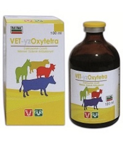 VET-YZOXYTETRA BİLEŞİMİ: 1 ml'sinde 50 mg Oxytetracycline baza eşdeğer 59 mg.oxytetracycline dihydrate bulunan san renkli berrak enjeksiyonluk çözeltidir. FARMAKOLOJİK ÖZELLİKLERİ: Oksitetrasiklin tetrasiklin grubuna bağlı geniş spektrumlu bir antibakteriyeldir, Oksitetrasiklin kendisine duyarlı mikroorganizmalara karşı ribozomunun 30 S alt ünitesine irreverzible bağlanmak suretiyle protein sentezini inhibe eder ve bakteriostatik bir etki gösterir. Oksitetrasiklin idrardan ve safradan değişmeden atılmaktadır. Bu nedenle üriner sistem rahatsızlıklarında oldukça etkilidir. Safra yoluyla atılan antibiyotiğin bir kısmı barsaklardan geri emilerek enterohepatik sirkülasyon sağlar. Bu durum ilacın yanlanma ömrünü 6-10 saat uzatmaktadır. Oksitetrasiklin pleura, periton ve meninksten geçer. Fötus kanında anneninkinin 1/3'ü seviyesine ulaşır. Parenteral uygulamadan sonra, safradaki konsantrasyonu kan plazmasındaki seviyesinin 20 misline çıkar. Bu sebeple, parenteral kullanım sonucu barsakta yüksek ve etkili konsantrasyonlarda oksitetrasiklin bulunur. Oksitetrasiklin'in antibiyotik aktivitesi vücut sıvılan, serum ve eksudatlann bulunduğu ortamda azalmamaktadır. Enjeksiyondan sonra ilacın bir kısmı hızla kan dolaşımına emilir ve dokulara dağılır. Kanda 4 saatte pik konsantrasyonuna ulaşılır. İlacm geri kalan kısmı enjeksiyon bölgesinde bir depo meydana getirir ve ilacın buradan yavaş yavaş absorbe olup vücuda dağılmasını temin ederek 3-5 gün süren bir etki sağlar. KULLANIM SAHASI / ENDİKASYON VET-YZOXYTETRA Enjeksiyonluk Çözelti sığır, koyun ve keçilerde oksitetrasikline duyarlı mikroorganizmalarca oluşturulan solunum, sindirim ve ürogenital sistem enfeksiyonlarında, septisemilerde, viral enfeksiyonlar ile beraber seyreden ve duyarlı bakteriler tarafından meydana getirilen sekonder enfeksiyonlarda endikedir. Bu kapsamda; sığır, koyun ve keçilerde başlıca pneumoni, ayak çürüğü, septisemi, enteritisler, Enfeksiyöz Keratokonjunktivitis, Koyunlann Enzootik Abortusu, Leptospirosis, Listeriosis, Anaplasmosis ve viral enfeksiyonlarla birlikte seyreden ve duyarlı bakterilere® meydana getirilen sekonder enfeksiyonlann tedavisinde ve mastitis ve metritislerde lokal tedaviye destek olarak kullanılır. KULLANIM ŞEKLİ VE DOZU VET-YZOXYTETRA, sığır, koyun ve keçilere derin kas içi enjeksiyon yolla uygulanır. Doz Veteriner Hekim tarafından başka şekilde önerilmediği taktirde: Farmakolojik doz tüm hayvanlar için 5 mg /kg /c.a.dır. Pratik doz 1 mlVET>YZOXYTETRA /10 kg / canlı ağırlıktır. Tedavi en az 3 gün sürdürülmelidir. Sığırlar için 20 mi, koyun ve keçiler için de 5 ml'den daha fazla kullanılması gerektiğinde toplam miktarı bölünerek iki aynı yere enjekte edilmesi gerekmektedir. İSTENMEYEN/YAN ETKİLER Gebelikte uzun süreli kullanımı fötüsta, kemiklerde ve dişte san yada gri rengin oluşumuna neden olabilir. Aynı etki çok genç hayvanlarda da söz konusudur. Yüksek dozlarda uzun süreli kullanıldığında, önceden hepatik yetmezliği bulunanlarda ve gebe hayvanlarda yağlı hepatik dejenerasyona bağlı olabilir. Tetrasiklinler foto sensitizasyona, alerjik reaksiyon ve enjeksiyon yerinde geçici bir lokal reaksiyona neden olabilir. Enjeksiyondan sonra sığırlarda geçici hemoglobinuriye bağlı idrar renginde koyulaşma meydana gelebilir. İLAÇ ETKİLEŞİMLERİ Ampisilin sodyum, amikasin sülfat, penisilin, karbenisilin sodyum, kloramfenikol sodyum süksinat, kloksasilin sodyum, meperidin HCl, metisilin sodyum, novobiosin sodyum, oksasilin sodyum, sefalosporinler, sülfadiazin, sodyum barbitüratlar, fenitoin , sodyum proklorperazin, pentobarbital sodyum, prometazin, kalsiyum bileşikleri, hidrokortizon sodyum süksinat, metilprednizolon sodyum süksinat, B grubu vitaminler ile geçimsizlik gösterir. Kalsiyum içeren çözeltilerle karıştırılmamalıdır. DOZ AŞIMINDA BELİRTİLER, TEDBİRLER VE ANTİDOT VET-YZOXYTETRA Enjeksiyonluk çözelti, uygun dozda iyi tolere edilir. Görülebilecek reaksiyonlarda semptomatik tedavi uygulanır. GIDALARDAKİ İLAÇ KALINTILARI HAKKINDA UYARILAR Ġlaç kalıntı arınma süresi (i.k.a.s.) Tedavi süresince ve son ilaç uygulamasından sonra eti için yetiĢtirilen hayvanlar 28 gün geçmeden kesime gönderilmemelidir. Tedavi süresince ve son ilaç uygulamasından sonra 8 gün (16 sağım) boyunca elde edilen süt tüketime sunulmamalıdır. Sağmal inek, keçi ve koyunlara uygulanması tavsiye edilmez KONTRENDİKASYONLAR: At, kedi ve köpeklerde kullanılmamalıdır. Tetrasikline duyarlı hayvanlarda, karaciğer ve böbrek yetmezliği olanlarda kullanılmamalıdır. Gebelikte kullanım: Tetrasiklinlerin yan etkileri nedeni ile gebeliğin ilk ve son 1/3'ün de kullanılmamalıdır. GENEL UYARILAR Kullanmadan önce ve beklenmedik bir etki görüldüğünde veteriner hekime damsınız. Çocukların ulaşamayacağı yerlerde bulundurunuz. Gıda maddelerinden uzakta bulundurunuz. Ambalajı hasarlı olan ürünleri satın almayınız ve kullanmayınız. MUHAFAZA ŞARTLARI VE RAF ÖMRÜ Direkt ışıktan koruyunuz. Serin bir yerde saklayınız. Raf ömrü : Üretim tarihinden itibaren 2 yıldır. AMBALAJIN NİTELİK VE MİKTARINI GÖSTEREN TİCARİ TAKDİM ŞEKLİ: VET-YZOXYTETRA Enjeksiyonluk çözelti, 10,20,30,50 ve 100 ml'lik amber renkli şişelerde satışa sunulmuştur. |