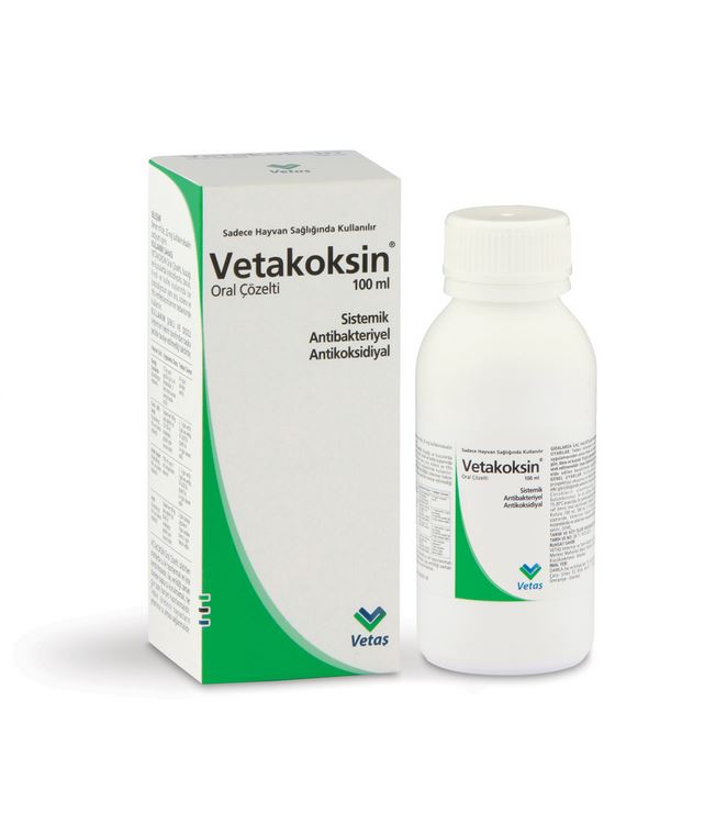 BİLEŞİMİ VETAKOKSİN Oral Çözelti, açık sarı, kokusuz, berrak bir çözelti olup, beher ml'de, 32 mg. Sulfakinoksalin sodyum içerir. KULLANIM SAHASI/ENDİKASYONLAR VETAKOKSİN Oral Çözelti, buzağı ve kuzularda koksidiyozis, etçi tavuk, hindi ve kafes kuşlarında ise koksidiyozun yanı sıra, kolera ve tifo enfeksiyonlarının tedavisinde kullanılır. Sülfonamidlere duyarlı olduğu bilinen hayvanlarda kullanılmamalıdır. Karaciğer ve böbrek yetmezliği olan hayvanlarda yan etki riski artacağındankullanılmamalıdır. KULLANIM ŞEKLİ VE DOZU Veteriner hekim tarafından başka şekilde tavsiye edilmediği takdirde; Sülfakinoksalin, tavuklarda günlük 40-50 mg/kg canlı ağırlık, hindilerde 20-30 mg/kg canlı ağırlık, dana ve kuzularda 13 mg/kg canlı ağırlık olacak şekilde