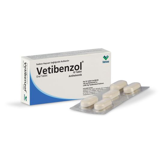 VETİBENZOL BİLEŞİMİ Her bir tablet içeriğinde 150 mg rafoksanid ve 2000 mg tiyabendazol bulunur. KULLANIM SAHASI/ENDİKASYONLAR VETİBENZOL Oral Tablet'in sığırlardaki sağaltım ve kontrol amaçlı iç paraziter spektrumu şöyledir; Karaciğer kelebekleri: Fasciola hepatica ve F.gigantica Kum Kelebeği: Dicrocoelium dentriticum, Mide-barsak kılkurtları: Bunostomum sp, Chabertia ovina, Gaigeria sp., Haemonchus sp. Nematodirus sp, Oesophagostomum sp., Ostertagia sp. Trichostrongylus sp.. Strongyloides sp, Akciğer kılkurtları: Dictyocaulus sp., Buzağılarda askarit invazyonları: Toxacara vitulorum. KULLANIM ŞEKLİ VE DOZU Veteriner hekim tarafından başka şekilde tarif edilmediği takdirde, VETİBENZOL Oral Tablet paraziter invazyon durumuna göre farklı 2 doz seçeneğine göre uygulanabilir. VETİBENZOL Oral Tablet'in normal dozu 20 kg canlı ağırlık için 1 tablettir (7.5 mg/kg rafoksanid + 100 mg/kg tiyabendazol). Bu dozda uygulandığında, 6 haftalıktan büyük genç formlar dahil, Karaciğer kelebeklerine, Kum Kelebeğine, Akciğer ve Mide-Barsak Kıl kurtlarına etkilidir. 40 kg vücut ağırlığı için 1 tablet (3.75 mg/kg rafoksanid + 50 mg/kg tiyabendazol farmakolojik etkin doz seviyesi) ise sadece ergin kelebekler ve Kıl kurtlarının hem erişkin ve hem de larval formlarına karşı kullanılır. Pratik doz tablosu şöyledir: