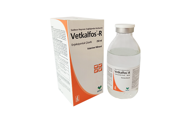 BİLEŞİMİ VETKALFOS-R Enjeksiyonluk Çözelti, renksiz, berrak, steril bir çözelti olup, beher ml’de etkin madde olarak 200,00 mg kalsiyum glukonat (17,9 mg kalsiyuma eşdeğer), 2,54 mg fosforilkolamin (0,56 mg fosfora eşdeğer), 3,34 mg magnezyum klorür hekzahidrat (0,39 mg magnezyuma eşdeğer) ve yardımcı madde olarak, antimikrobiyal koruyucu amaçlı metil paraben (E218) ve propil paraben (E216) içerir. Toplam mineral miktarı 18.85 mg/ml’dir. FARMAKOLOJİK ÖZELLİKLERİ Farmakodinamik Özellikler: VETKALFOS-R Enjeksiyonluk Çözelti, kalsiyum-magnezyum-fosfor dengesini sağlayan maddeler içerir. Bu iyonların dengesinin bozulması doğum felcinin en çok görülme nedenidir. Vetkalfos-R içindeki kalsiyum, kalsiyum glukonat ve borik asit arasındaki reaksiyondan elde edilen kalsiyum boroglukonat kompleksinden oluşmaktadır. Fosfor fosforilkolamin tarafından, magnezyum da magnezyum klorür hekzahidrat tarafından temin edilir. Kandaki iyon dengesi üzerine yaptığı direkt etkiden başka; fosfor, sorbitol ile birlikte tonik ve enerji verici aktiviteye sahiptir. Ayrıca sorbitol, karaciğer üzerinde detoksifiye edici etkiye sahiptir. Farmakokinetik Özellikler: Kalsiyum, magnezyum tuzları ve fosforilkolamin kanda çok sayıda metabolik reaksiyonlara dahil olarak ilgili elektrolitleri serbest bırakır. Fosfor ve magnezyum idrar, kalsiyum ise dışkı ile atılır. KULLANIM SAHASI/ENDİKASYONLAR VETKALFOS-R Enjeksiyonluk Çözelti, sığır, at, buzağı, tay, koyun, keçi, kuzu, oğlak, tavşan, köpek ve kedilerde etkin maddelerin eksikliğine bağlı olarak şekillenen doğum öncesi ve doğum sonrası paraplejide, alerjik rahatsızlıklarda ve tonisite ajanı olarak, gebe ineklerde ise gıda geçişinin hızlanmasından kaynaklı transit tetani tedavisinde ve süt humması tedavisinde kullanılmaktadır. KULLANIM ŞEKLİ VE DOZU Veteriner hekim tarafından başka şekilde tavsiye edilmediği takdirde; Damar içi (i.v), periton içi (i.p), deri altı (s.c) ya da kas içi (i.m) yoldan yavaş yavaş enjekte edilir. Hedef Tür Uygulama Dozu Sığır, at 250 ml / hayvan Buzağı, tay, koyun ve keçi 50-150 ml / hayvan Kuzu, oğlak, tavşan, köpek ve kedi 15-50 ml / hayvan Veteriner hekimin kararına göre doz tekrarlanabilir. Ö ZEL KLİNİK BİLGİLER VE HEDEF TÜRLER İÇİN UYARILAR Kalp hastalığı olan hayvanlarda dikkatli kullanılmalıdır. Uygulama sırasında hayvanın nabzı ve kalp ritmi kontrol edilmelidir. Aritmi oluşması halinde derhal uygulama durdurulmalıdır. Sıvı dengesi, elektrolitler ve plazma osmolaritesi izlenmelidir. Çözelti, hipertoniktir. Perfüzyon hızı kontrollü olacak şekilde damar içi enjeksiyon tavsiye edilir. Perfüzyon ile kullanılması durumunda, flakonda bulunan ürün bir defa kesintisiz şekilde uygulanmalı ve kalan ilaç atılmalıdır. Hiperkalsemiden dolayı ani kalp durmasına neden olmamak için damar içi yavaşça verilmelidir. Kas içi ve deri altı uygulamalarında enjeksiyon bölgesinde oluşabilecek enfeksiyonlara karşı asepsiye dikkat edilmelidir. Gebelik ve Laktasyonda Kullanım: Ürün gebelik ve laktasyon sırasında veteriner hekim tarafından risk/yarar değerlendirmesi yapılarak kullanılmalıdır. İSTENMEYEN/YAN ETKİLER Aritmiye neden olabilir. Damar içi uygulamadan sonra, kalpte düzensizlik, bradikardi, kalp blokajı, kusma, bulantı ve enjeksiyon bölgesinde reaksiyon görülebilir. Kardiyotoksisitenin önlenmesi için uygulamanın yavaş ve asepsiye dikkat edilerek yapılması önerilir. İLAÇ ETKİLEŞİMLERİ VETKALFOS-R Enjeksiyonluk Çözelti ile eş zamanlı olarak D vitamini verilmesi bağırsaklardan kalsiyum emilimini uyarır ve böbreklerden atılımını azaltır. Kalsiyum tuzları, tetrasiklinler ve sefalosporinlerin emilimini azaltır. Bu nedenle, eş zamanlı kullanımı tavsiye edilmez. Enjeksiyonluk kalsiyum glukonat, metoklopramid hidroklorür, metilprednizolon sodyum süksinat, amfoterisin B, sefamandol nafat, sefalotin sodyum, dobutamin hidroklorür ile geçimsizdir. Bikarbonat, fosfat, sülfat ve tetrasiklin bazlı ilaçlarla karıştırılmamalıdır. Kalp glikozidleri ile birlikte kullanılmamalıdır. GIDALARDA İLAÇ KALINTILARI HAKKINDA UYARILAR İlaç kalıntı arınma süresi (i.k.a.s.): Et ve süt için “0” gündür. KONTRENDİKASYONLAR Digitalis tedavisi sırasında kalsiyum uygulaması kontrendikedir, kalsiyum uygulaması düzensiz kalp atışlarına neden olabilir. Konjestif kalp yetmezliğinde dikkatli bir şekilde kullanılmalıdır. Kronik böbrek yetmezliğinde kullanılmamalıdır. Eş zamanlı olarak D vitamini verilmesi bağırsaklardan kalsiyum emilimini uyarır ve böbreklerden atılımını azaltır. Çözeltinin parenteral yolla hızla uygulanması hiperkalsemiye neden olabilir. Etkin maddeye ve/veya yardımcı maddelere karşı aşırı duyarlılığı olan hayvanlarda kullanılmamalıdır. DOZ AŞIMINDA BELİRTİLER, TEDBİRLER VE ANTİDOT Tavsiye edilen dozları aşmayınız. Diğer bütün kalsiyum preparatları gibi usulüne uygun yapılmayan tatbikatta ve aşırı yüksek dozda kalpte aritmi ve blokaja sebep olabilir. Antidotu, atropin sülfattır. Aşırı doza ve uygulama hızına bağlı olarak halsizlik, titreme, taşikardi, hipertermi, güçsüzlük, siyanoz ve ventriküler fibralasyon görülebilir. Bu tür durumlarda infuzyon hızı azaltılmalı veya uygulamaya son verilmelidir. Hiperkalsemiden dolayı ani kalp durmasına neden olmamak için damar içi kalsiyum yavaşça verilmelidir. KULLANIM SONU İMHA VE HEDEF OLMAYAN TÜRLER İÇİN UYARILAR Kullanılmayan veteriner tıbbi ürün veya bu ürünün kullanımıyla ortaya çıkan atık maddeler yasalara göre tıbbi atık olarak imha edilmelidir. GENEL UYARILAR Kullanmadan önce ve beklenmeyen bir etki görüldüğünde veteriner hekime danışınız. Çocukların ulaşamayacağı yerde bulundurunuz. UYGULAYICININ ALMASI GEREKEN ÖNLEMLER VE HEKİMLER İÇİN UYARILAR Etken m
