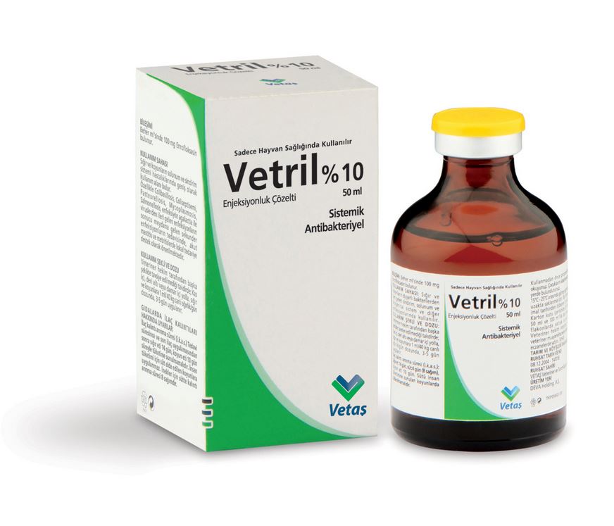 Sadece Hayvan Sağlığında Kullanılır VETRİL %10 Enjeksiyonluk Çözelti BİLEŞİMİ Vetril %10 Enjeksiyonluk Çözelti; karakteristik kokulu, hafif sarımtırak renkli, steril berrak bir solüsyon olup, beher ml’sinde 100 mg Enrofloksasin ihtiva eder. FARMAKOLOJİK ÖZELLİKLERİ Vetril %10 Enjeksiyonluk Çözelti’nin etken maddesi olan enrofloksasin florokinolonlar grubuna dahil bir antibiyotik olup geniş bir etki spektrumuna sahiptir. Enrofloksasin bakterilerde DNA replikasyonunu temin eden DNA giraz (Topoizomeraz II) enziminin etkinliğini engelleyerek, hücre hacminde anormal derecede genişlemeye yol açarak bakterinin ölümüne neden olur. Bu özel etki mekanizması sayesinde diğer antibakteriyellere direnç geliştirmiş bakteriler üzerinde de etki göstermektedir. Enrofloksasin’in etki spektrumuna giren başlıca mikroorganizmalar şöyledir; Escherichia coli, Klebsiella spp., Salmonella spp., Proteus spp., Serratia marcescens, Citrobacter spp., Yersinia spp., Campylobacter spp., Pseudomonas aeruginosa, Bordetella bronchiseptica, Pasteurella multocida, Pasteurella haemolytica, Vibrio parahaemolyticus, Treponema hyodysenteria, Bacillus cereus, Staphylococcus aureus, Staphylococcus hyicus, Streptococcus spp., Corynebacterium pyogenes, Listeria monocytogenes, Erysipelothrix spp., Mycoplasma spp., Actinobacillus spp., Bacteroides spp., Clostridium perfringens, Haemophilus spp.. Streptococcus suis, Streptococcus agalactia, Streptococcus dysgalactia, Streptococcus zooepidemicus, Rhodococcus equi, Mycobacterium türlerine orta derecede duyarlılık gösterir. Anaerobik kokların çoğu, Clostridium spp., Bacteroides spp., ve Pseudomonas maltophila kinolonlara genellikle az duyarlı veya dirençlidir. Enrofloksasin paranteral uygulamadan sonra iyi bir şekilde emilir. Biyoyararlılığı %80 - %90 oranındadır. Uygulama sonrası ortalama 2 saat içinde plazma derişimi doruk noktaya erişir. Plazma proteinlerine düşük oranda bağlanır. Geniş oranda hücre içi ve hücre dışı sıvılara geçer. Dokularda bulunan miktarı serumdakinden 3 kez daha fazladır. Yüksek seviyede bulunduğu dokular özellikle akciğer, karaciğer, böbrek, kemik ve lenfatik sistemdir. Yarılanma ömrü yaklaşık 10 saattir. Başlıca safra ve idrarla atılır. Eliminasyon yarılanma ömrü 4-6 saattir. %50’ye yakın kısmı değişmeden tubuler sekresyonla idrarla atılır. KULLANIM SAHASI/ENDİKASYONLAR Sığır ve koyunların solunum ve sindirim sistemi hastalıklarında geniş olarak kullanım alanı bulur. Özellikle Colibasillosis, Coliseptisemi, Pasteurellosis, Mycoplasmosis, Salmonellosis, enfeksiyöz agalactia ile viruslerden ileri gelen enfeksiyonların sonucu meydana gelen sekonder enfeksiyonların tedavisinde, akut mastitis ve metritislerde lokal tedaviye destek olarak önerilmektedir. KULLANIM ŞEKLİ VE DOZU Veteriner hekim tarafından başka bir şekilde tavsiye edilmediği takdirde; enrofloksasin’in kas içi, deri altı veya damar içi yolla farmakolojik dozu günlük sığır ve koyun için 2.5 mg/ kg canlı ağırlık/gün’dür. Buna göre pratik doz günlük dozlar şöyledir; Sığır, dana, düve, buzağı : 2.5 ml / 100 kg canlı ağırlık, Koyun : 1 ml / 40 kg canlı ağırlık, Kuzu : 0.5 ml / 20 kg canlı ağırlık, Tedavilere 3-5 gün devam edilir. Salmonella ve komplike olmuş solunum sistemi hastalığında doz iki katına çıkarılabilir ve tedavi süresi 5 gün yapılır. Sığırlarda; deri altı uygulama yapılırken bir bölgeye 10 ml’den fazla ilaç uygulanmamalı, doz bölünerek farklı yerlere uygulanmalıdır. Koyunlarda uygulanacak ilaç miktarı 5 ml’yi geçerse ilaç bölünerek uygulanmalıdır. Uygulama sırasında asepsi ve antisepsi kurallarına uyulmalıdır. İSTENMEYEN/YAN ETKİLER Özellikle hızlı gelişme dönemindeki genç hayvanlarda eklem kıkırdağı bozukluklarına neden olabilir. Kinolonlar nadiren çırpınmalara neden olabilirler. Bu nedenle merkezi sinir sistemi ile ilgili rahatsızlığı olduğu bilinen veya şüphelenilen hastalarda dikkatli kullanılmalıdır. Siprofloksasin ve enrofloksasin gibi bazı kinolonlar bazen idrar yollarında kristallenmeye yol açabilir. Bu nedenle bu ilaçlar verilirken su kısıtlaması yapılmamalıd Gebelikte kullanım: Sığırlarda: Gebe sığırlarda gebeliğin 1. periyodunda güvenle kullanılır. Gebeliğin 3. periyodunda ise veteriner hekim tarafından fayda/risk değerlendirmesi yapılarak ürün kullanılabilir. Ürün laktasyon döneminde kullanılabilmektedir. Koyun: Gebelik ve laktasyon döneminde kullanım güvenliğine yönelik yeterli veri bulunmamaktadır. Sadece sorumlu veteriner hekim fayda/risk değerlendirmesi sonucuna göre ürünü önerebilir. İLAÇ ETKİLEŞİMLERİ Enrofloksasinin karaciğerde metabolize edildiği bilinen diğer ilaçlarla birlikte kullanılması, söz konusu ilaçların farmakokinetiğini etkiyelebilir. Kinolonlar teofilin, kumarin türevleri, metil ksantinler ve steroid yapıda olmayan ağrı kesicilerin yarı ömürlerini uzatır. Florokinolonlar ile aminogikozidler, beta-laktam ilaçlar ve sülfonamidler arasında aynı yönde (sinerjistik); fenikoller, eritromisin, polimiksin, nitrofurantoin ve rifampin arasında aksi yönde (antagonist) etkileşmeler vardır. DOZ AŞIMINDA BELİRTİLER, TEDBİRLER VE ANTİDOT Aşırı dozda kedilerde, konvülsiyonlar, depresyon, inkoordinasyon, iştah kaybı, köpeklerde konvülsiyonlar, depresyon veya eksitasyon, inkoordinasyon, iştah kaybı, kaslarda tremor, salivasyon ve kusma görüldüğü bildirilmiştir. Belirtilen etkiler ilaç kesildiğinde, kısa bir sürede kendiliğinden ortadan kalkar. Çok yüksek dozlarda kedilerde böbrek hasarına ve geçici ya da kalıcı körlüğe yol açabilir. GIDALARDA İLAÇ KALINTILARI HAKKINDA UYARILAR İlaç kalıntı arınma süresi (i.k.a.s.): Tedavi süresince ve son ilaç uygulamasını takiben sığır eti 14 gün, koyunlar 10 gün süreyle kesime