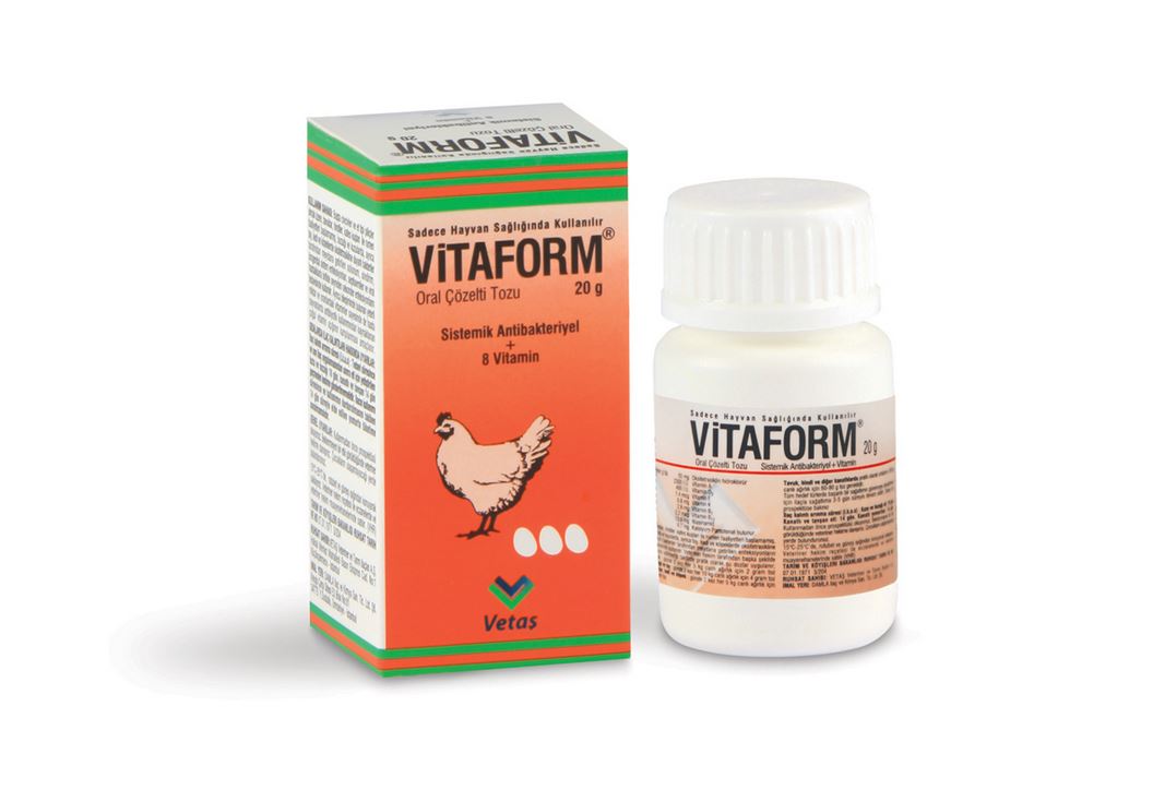 Sadece Hayvan Sağlığında Kullanılır VİTAFORM Oral Çözelti Tozu Sistemik Antibakteriyel+Vitamin BİLEŞİMİ VİTAFORM Oral Çözelti Tozu, pembe renkli, karakteristik kokulu homojen bir toz olup, suda çözdürüldüğünde portakal renkli bir çözelti verir. Beher g.’da; Oksitetrasiklin HCl 55 mg, Vitamin A 2300 I.U., Vitamin D3 400 I.U., Vitamin B2 2.90 mg, Vitamin B12 2.20 mcg, Vitamin K3 0.80 mg, Vitamin E 1.40 mg, Niasinamid 13.50 mg, Kalsiyum pantotenat 4.70 mg bulunur.FARMAKOLOJİK ÖZELLİKLERİ VİTAFORM Oral Çözelti Tozu, hayvanların içme suyuna katılarak verilmeye uygun bir antibiyotik ve vitamin kombinasyonudur. Ürünün etkin maddesi olan oksitetrasiklin HCl, tetrasiklin grubuna bağlı geniş spektrumlu bir antibakteriyel olup, kendisine duyarlı mikroorganizmalarda protein sentezini inhibe eder. Terapötik dozlarda bakteriyostatik yüksek yoğunluklarda bakterisit etkilidir. Oksitetrasiklinin çok düşük MIC değerlerine bile yüksek düzeyde duyarlı olan bakteriler arasında; gram-pozitif aeroblar (Bacillus sp., Corynebacterium sp., Erysipelothrix rhusiopathia, Listeria monocytogenes ve Streptococci.), gram negatif bakteriler (Actinobacillus sp., Bordetella sp., Brucella sp., Francisella tularensis, Haemophilus sp., Pasteurella multocida, P. haemolytica, Yersinia sp., Campylobacter fetus, Borrelia sp. ve Leptospira sp. Moraxella bovis), anaeroblar patojenler (Actinomyces sp., Fusobacterium sp., Mycoplasma sp., Chlamydia sp., Ehrlichia sp., Coxiella burnetti, Ehrlichia,) ve Theileria, Eperythrozoon ve Anaplasma’lar gibi protozoalar bulunur. Staphylococci, Enterococci, Enterobacter sp., Enterobacteriaceae familyasına dahil Enterobacter sp., E.coli, Klebsiella sp., Proteus sp., Salmonella sp., Anaerop bakterilerden Bacteroides sp. ve Clostridium sp. Oksitetrasikline karşı direnç kazandıkları için bu bakterilere karşı etkisi değişkendir. Oksitetrasikline dirençli bakteriler; Mycobacterium sp., Proteus vulgaris, Pseudomonas aeroginosa, Serratia sp., Mycoplasma bovis ve M. hyopneumoniae ‘dır. VİTAFORM Oral Çözelti Tozu, kullanılma sahaları dikkate alınmak suretiyle; hasta hayvanlarda antibakteriyel kullanımından kaynaklanan vitamin açığının karşılanması, sağaltım aşamasında ileri derecede gerekli olan çoğul vitamin desteğinin sağlanması ve nekahat döneminin kısaltılması amaçlarıyla, evcil hayvanlar için yaşamsal öneme sahip 8 esas vitamini uygun oran ve yeterli miktarlarda içerecek şekilde formüle edilmiştir. Vitamin A: Büyüme, gelişme ve üreme etkinliklerinin sürdürülmesi, immun yanıtların düzenlenmesi, her çeşitten hayvansal verimliliğin optimum ölçülerde artırılması bakımlarından gerkli olan temel mikro besin maddelerinden biridir. Vitamin D3 (kolekalsiferol): Plazma Ca ve P düzeylerini yükselterek, kemiklerin normal mineralizasyonunu, diğer dokulardaki fizyolojik işlevlerin yürütülmesini sağlar. Yumurta kabuğunun sağlamlaştırır. Vitamin B2: Aminoasit metabolizması, transmetilasyon ve transülfürasyon için kesinlikle gereklidir. Riboflavin hemoglobin sentezinde katalizör rol oynamaktadır. Vitamin B12: Büyüme ve verim faktörüdür. Civciv ve piliçler için oldukça gereklidir. Vitamin K3: Protrombin oluşumunu sağlar. Bu yüzden kan koagulasyonu için gereklidir. Kanamayı önler, özellikle barsak hastalıklarında ve parazitlerin sebep olduğu kanamaların tedavisinde önemli yeri vardır. Vitamin E (tokoferol): İntraselüler serbest oksijen radikallerinin şekillenmesini engelleyerek hücresel zarların dayanıklılığını artırır. A vitamininin oksidasyonunu önler ve karaciğerde depolanmasını sağlar. Niasinamid: Karbonhidrat, protein ve lipid metabolizmasında etkilidir. Büyüme için gereklidir. Kalsiyum pantotenat:. Lipid ve glukoz metabolizmasında etkili olan koenzim A’nın temel bileşenidir. Oksitetrasiklin hızlı ve yüksek konsantrasyonda emilerek tüm vücuda yayılır ve kandaki yarılanma ömrü 6 - 8 saat arasındadır. Oksitetrasiklin büyük oranda idrarla ve daha düşük oranlarda da safra yoluyla atılır. Bu nedenle üriner sistem rahatsızlıklarında, karaciğer enfeksiyonlarında oldukça etkilidir. Safra yoluyla atılan kısmı barsaklardan geri emilerek enterohepatik dolaşıma girer. KULLANIM SAHASI/ENDİKASYONLAR VİTAFORM Oral Çözelti Tozu, başta civcivler ve et tipi piliçler olmak üzere, tavuklar, hindiler, kafes kuşları ile rumen faaliyetleri başlamamış, buzağı ve kuzularda, ayrıca tay, kedi ve köpeklerde oksitetrasikline duyarlı bakteriler tarafından meydana getirilen solunum, sindirim, ürogenital sistem enfeksiyonları, septisemiler ve viral hastalıklarla birlikte seyreden sekonder enfeksiyonların tedavisinde kullanılır. Kanatlılarda başlıca önemli kanatlı hastalıklarından kronik solunum yolu enfeksiyonu (CRD), enfeksiyöz sinovitis, kanatlı korizası ve kolerası, diğer bakteriyel ishaller, hava kesesi iltihabı ve borreliozis hastalıkları ile hindilerin önemli enfeksiyöz hastalıklarından olan enfeksiyöz sinovitis ve mavi ibik hastalıkları, Ruminal etkinliği başlamamış buzağı ve kuzular ile tay, tavşan, kedi ve köpeklerde yaygın biçimde karşılaşılan neonatal septisemiler, E.coli enfeksiyonları(Colibacillosis, Colisepticemia), Salmonellosis, diğer duyarlı bakterilerce oluşturulan enteritler, bakteriyel pnömoniler, bronkopnömoniler, Pasteurellosis ve viral enfeksiyonlarla birleşen sekonder solunum sistemi enfeksiyonları, Mycoplasma sp.’ye bağlı enfeksiyonların klinik sağaltımında kullanılır. KULLANIM ŞEKLİ VE DOZU Veteriner hekim tarafından başka şekilde tavsiye edilmediği takdirde; Vitaform Oral Çözelti Tozu’nun aktif maddesini oluşturan oksitetrasiklin’in hedef hayvan türleri için önerilen günlük oral sağaltım dozu tüm kanatlı türlerinde günde 30 – 40 mg/kg canlı ağırlık, tay, buzağı, kuzularda 40 mg/kg canl