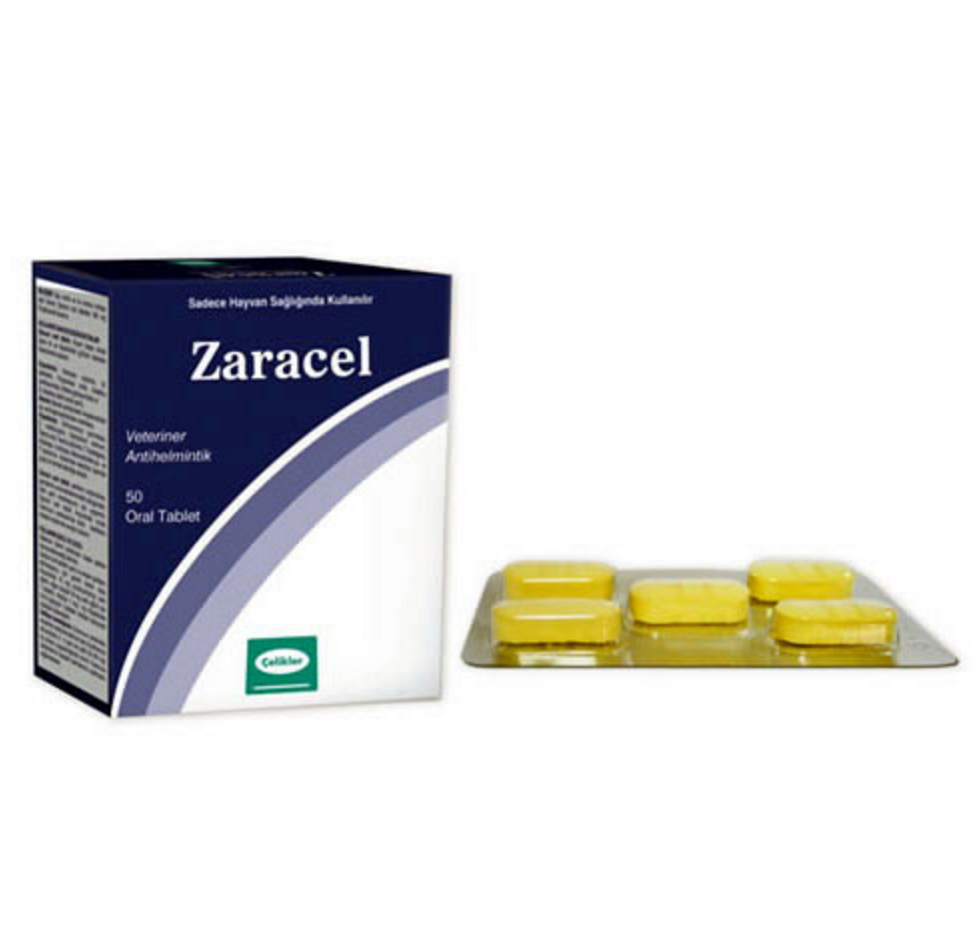 BİLEŞİMİ Her tablet 300 mg Prazikuantel içerir. ENDİKASYONLAR Zaracel Oral Tablet, Koyun başta olmak üzere at ve köpeklerde görülenTaeniasistedavisindekullanılır. Koyunlarda; Moniezia expansa, M. benedi, Thysaniezia ovilla, Avitellina centripunctata, Stilesia globipunctata ve S. hepatica ( safra kanalı şeridi), Atlarda; Barsak şeritlerinden Anaplocephala sp. ve Anaplocephaloides mamillana, Köpeklerde;Echinococcus granulosus, E. multiocularis, Diphylidium caninum, Taenia ovis, Taenia psiformis, T. hydatigena, Multiceps multiceps, Mesocestoides sp. ve T. teniformis türlerinden sestodlar üzerinde güçlü bir tenisid etkinliğe sahiptir. Zaracel Oral Tablet şeritlerin erişkinlerine, gençlerine ve skolekslerine etkili olduğundan, total şerit eradikasyonu için uygundur. Zaracel Oral Tablet koyunlarda kronik Coenurus cerebralis’de klinik belirtilerini ortadan kaldırmak amaçlı kullanılır. KULLANIM ŞEKLİ VE DOZU Veteriner hekim tarafından başka şekilde tavsiye edilmediği takdirde;Zaracel Oral Tablet’in genç ve erişkin şeritlerin eliminasyonu için gerekli olan Farmakolojik dozu;Koyunlarda, 15 mg Prazikuantel/kg canlı ağırlık, Atlarda 1 mg/kg ca, Köpeklerde 5 – 10 mg/kgca’dır. Tabletler ortadan bölünmek suretiyle kullanılabilir. Delibaş hastalığında (Coenurus cerebralis)ve periton sistiserkoidlerine karşı (Cysticercus tenuicollise) 2 – 5 gün üst üstte 50 – 100 mg/kg cadozda uygulandığında kronik Coenurus cerebralis’te hastalık belirtilerinin azalmasını sağlamaktadır. Pratik doz tablosu:
