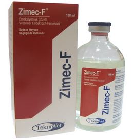 BİLEŞİMİ Her ml’sinde 10 mg İvermektin ve 100 mg Klorsulon içerir. KULLANIM YERİ /ENDİKASYONLARI Zimec-F Enjeksiyonluk Çözelti, sığırlarda karaciğer kelebekleri de dahil aşağıda isimleri yazılı iç ve dış parazitlere karşı kullanılır. Sığırlarda Karaciğer kelebekleri : Ergin Fasciola hepatica ve Fasciola gigantica , Gastro-intestinal nematodlar: Heamonchus placei, Ostertagia spp., O.ostertagi (erginler, larval devreler, hipobiotik larvalar), O.Iyrate (erginler, L4 larvalar), Mecistocirrus digitatus (erginler), Trichostrongylus axei, T.colubriformis, Cooperia oncophora, C.punctata, C.pectinata, Cooperia sp.,Nematodirus helvetianus (erginler), N.spathiger (erginler), Oesophagostomum radiatum, Strongyloides papillosus (erginler), Bunostomum phlebotumum Toxacara vitulorum, Akciğer kıl kurtları: Dictyocaulus viviparus, Deride filariosis etkenleri: Parafilaria bovicola, Göz nematodları: Thelezia sp. (ergin), Nokra etkeni sinek larvaları:Hypoderma bovis (larva),Hypoderma lineatum(larva) Myiasis etkeni : Dermatobia hominis (larva), Yara kurtları (parazitik dönemde): Chrysomya bezziana, Cochliomya hominivorax, Uyuz etkenleri: Psoroptes communis bovis, Sarcoptes scabei var. bovis, Chorioptes bovis, Bitler: Linognatus vituli, Haematophinus eurysternus, Solenopotes capillatus, Damalinia bovis, Keneler (bazı tek konaklı keneler,yumuşak keneler) : Boophylus sp, Ornithodurus savignyi. KULLANIM ŞEKLİ VE DOZU Zimec-F Enjeksiyonluk Çözelti, sadece deri altı yol ile uygulanır.Sığırlarda boyun bölgesinde veya scapula gerisinde gevşek deri altına enjekte edilir.Uygulama yapılırken asepsi ve antisepsi kurallarına uyulmalı, kuru, steril enjeksiyon iğnesi ve enjektör kullanılmalıdır. Veteriner hekim tarafından başka şekilde tavsiye edilmediği taktirde : 0.2 mg İvermektin / kg c.a. ve 2 mg Klorsulon / kg c.a. doz hesabıyla, 1 ml Zimec-F Enjeksiyonluk Çözelti / 50 kg c.a. olacak şekilde uygulanır. Pratik doz tablosu şöyledir; SIĞIR 50-100 kg 1-2 ml, 100-200 kg 2-4 ml, 200-400 kg 4-8 ml 10 ml’den daha fazla hacimdeki dozların bölünerek ayrı yerlere enjekte edilmesi tavsiye olunur. Sadece deri altı enjeksiyona mahsustur. Kas içi ve damar içi yolla kullanmayınız. |