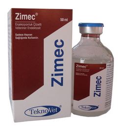 BİLEŞİMİ Her ml’sinde 10 mg İvermectin içerir. KULLANIM YERİ / ENDİKASYONLARI Zimec Enjeksiyonluk Çözelti, sığır ve koyunlarda aşağıda isimleri yazılı iç ve dış parazitlere karşı kullanılır: Sığırlarda; Gastro-intestinal Nematodlar: Heamonchus placei, Ostertagia spp., O.ostertagi (erginler, larval devreler, hipobiotik larvalar), O.Iyrate (erginler, L4 larvalar), Mecistocirrus digitatus (erginler), Trichostrongylus axei, T.colubriformis, Cooperia oncophora, C.punctata, C.pectinata, Cooperia spp.,Nematodirus helvetianus (erginler), N.spathiger (erginler), Oesophagostomum radiatum, Strongyloides papillosus (erginler), Bunostomum phlebotumum Toxacara vitulorum. Akciğer Kıl Kurtları: Dictyocaulus viviparus Deride Filariosis Etkenleri: Parafilaria bovicola Göz Nematodları: Thelezia spp (ergin) Nokra etkeni sinek larvaları: Hypoderma bovis (larva), Hypoderma lineatum (larva) Dermatobia hominis (larva) Yara Kurtları (parazitik dönemde): Chrysomya bezziana, Cochliomya hominivorax Uyuz Etkenleri: Psoroptes communis bovis, Psoroptes communis ovis, Sarcoptes scabei bovis, Chorioptes bovis Bitler: Linognatus vituli, Haematophinus eurysternus, Solenopotes capillatus, Damalinia bovis Keneler (bazı tek konaklı keneler,yumuşak keneler) : Boophylus spp, Ornithodurus savignyi Koyunlarda; Gastro-intestinal Nematodlar:Heamonchus spp., Ostertagia spp., Trichostrongylus spp., Cooperia spp., Nematodirus spp.,Oesophagostomum spp., Strongylus papillosus, Chaberthia ovina, Trichuris ovis Akciğer Kıl Kurtları: Dictyocaulus filaria Uyuz Etkenleri: Sarcoptes scabei var. Ovis, Psoroptes ovis, Chorioptes bovis var. ovis Bitler: Bovicola ovis, Linognatus pedalis, L.ovillus, L.stenopsis Koyun Yapağı Sineği : Melophaga ovinus Burun Kurtları: Oestrus ovis Yara Kurtları: Chrysomia bezziani Keneler (Tek konaklı):Boophylus spp., Ornithodurus lahorensis KULLANIM ŞEKLİ VE DOZU Zimec Enjeksiyonluk Çözelti, sadece deri altı yolla uygulanır. Sığırlarda boyun bölgesinde veya scapula gerisinde gevşek deri altına, koyunlarda koltuk altı veya koltuk arkasında derinin gevşek bölgesinde deri altı yolla enjekte edilir. Uygulama yapılırken asepsi ve antisepsi kurallarına uyulmalı, kuru, steril enjeksiyon iğnesi ve enjektör kullanılmalıdır. Zimec Enjeksiyonluk Çözelti Veteriner Hekim tarafından başka şekilde tavsiye edilmediği takdirde, : 0.2 mg İvermectin / kg canlı ağırlık doz hesabıyla, 1 ml Zimec Enjeksiyonluk Çözelti / 50 kg canlı ağırlık şeklinde uygulanır. Pratik doz tablosu şöyledir;